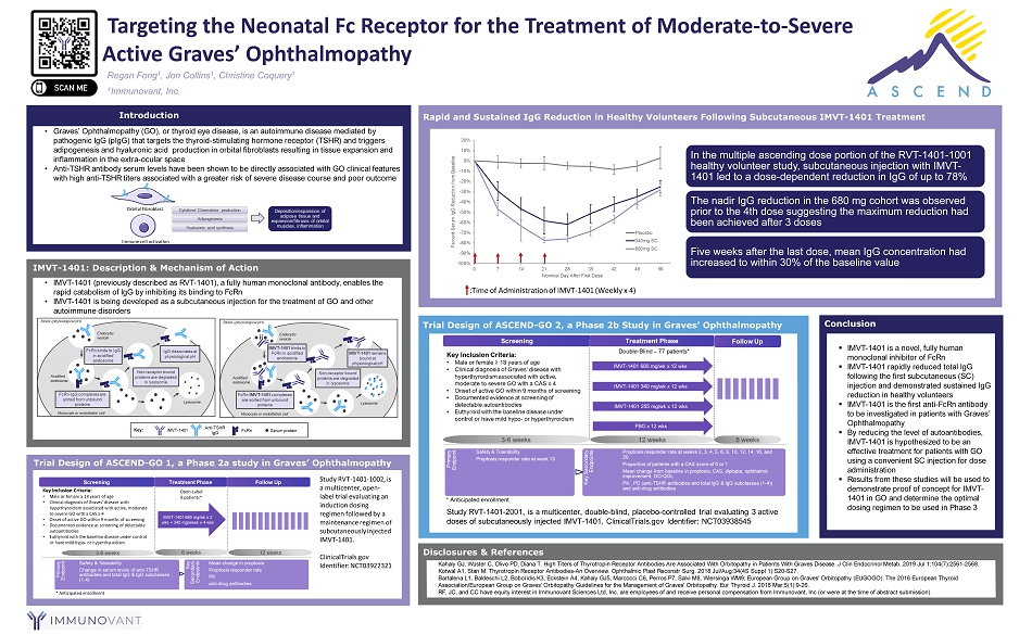 • Graves’ Ophthalmopathy (GO), or thyroid eye disease, is an autoimmune disease mediated by pathogenic IgG ( pIgG ) that targets the thyroid - stimulating hormone receptor (TSHR) and triggers adipogenesis and hyaluronic acid production in orbital fibroblasts resulting in tissue expansion and inflammation in the extra - ocular space • Anti - TSHR antibody serum levels have been shown to be directly associated with GO clinical features with high anti - TSHR titers associated with a greater risk of severe disease course and poor outcome • IMVT - 1401 (previously described as RVT - 1401), a fully human monoclonal antibody, enables the rapid catabolism of IgG by inhibiting its binding to FcRn • IMVT - 1401 is being developed as a subcutaneous injection for the treatment of GO and other autoimmune disorders ▪ IMVT - 1401 is a novel, fully human monoclonal inhibitor of FcRn ▪ IMVT - 1401 rapidly reduced total IgG following the first subcutaneous (SC) injection and demonstrated sustained IgG reduction in healthy volunteers ▪ IMVT - 1401 is the first anti - FcRn antibody to be investigated in patients with Graves’ Ophthalmopathy ▪ By reducing the level of autoantibodies, IMVT - 1401 is hypothesized to be an effective treatment for patients with GO using a convenient SC injection for dose administration ▪ Results from these studies will be used to demonstrate proof of concept for IMVT - 1401 in GO and determine the optimal dosing regimen to be used in Phase 3 IMVT - 1401: Description & Mechanism of Action Trial Design of ASCEND - GO 1, a Phase 2a study in Graves’ Ophthalmopathy Rapid and Sustained IgG Reduction in Healthy Volunteers Following Subcutaneous IMVT - 1401 Treatment Trial Design of ASCEND - GO 2, a Phase 2b Study in Graves’ Ophthalmopathy Conclusion Introduction Regan Fong 1 , Jon Collins 1 , Christine Coquery 1 Disclosures & References Kahaly GJ, Wüster C, Olivo PD, Diana T. High Titers of Thyrotropin Receptor Antibodies Are Associated With Orbitopathy in Patients With Graves Disease. J Clin Endocr ino l Metab . 2019 Jul 1;104(7):2561 - 2568. Kotwal A1, Stan M. Thyrotropin Receptor Antibodies - An Overview. Ophthalmic Plast Reconstr Surg. 2018 Jul/Aug;34(4S Suppl 1):S20 - S27. Bartalena L1, Baldeschi L2, Boboridis K3, Eckstein A4, Kahaly GJ5, Marcocci C6, Perros P7, Salvi M8, Wiersinga WM9; European Group on Graves' Orbitopathy (EUGOGO). The 2016 European Thyroid Association/European Group on Graves' Orbitopathy Guidelines for the Management of Graves' Orbitopathy. Eur Thyroid J. 2016 M ar; 5(1):9 - 26. RF, JC, and CC have equity interest in Immunovant Sciences Ltd, Inc, are employees of and receive personal compensation from Immunovant , Inc (or were at the time of abstract submission). Targeting the Neonatal Fc Receptor for the Treatment of Moderate - to - Severe Active Graves’ Ophthalmopathy 1 Immunovant, Inc. In the multiple ascending dose portion of the RVT - 1401 - 1001 healthy volunteer study, subcutaneous injection with IMVT - 1401 led to a dose - dependent reduction in IgG of up to 78% The nadir IgG reduction in the 680 mg cohort was observed prior to the 4th dose suggesting the maximum reduction had been achieved after 3 doses Five weeks after the last dose, mean IgG concentration had increased to within 30% of the baseline value