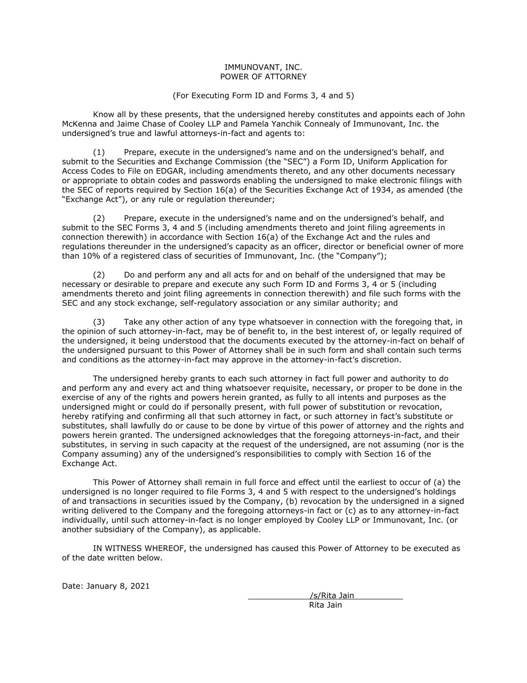 IMMUNOVANT, INC. POWER OF ATTORNEY (For Executing Form ID and Forms 3, 4 and 5) Know all by these presents, that the undersigned hereby constitutes and appoints each of John McKenna and Jaime Chase of Cooley LLP and Pamela Yanchik Connealy of Immunovant, Inc. the undersigned’s true and lawful attorneys-in-fact and agents to: (1) Prepare, execute in the undersigned’s name and on the undersigned’s behalf, and submit to the Securities and Exchange Commission (the “SEC”) a Form ID, Uniform Application for Access Codes to File on EDGAR, including amendments thereto, and any other documents necessary or appropriate to obtain codes and passwords enabling the undersigned to make electronic filings with the SEC of reports required by Section 16(a) of the Securities Exchange Act of 1934, as amended (the “Exchange Act”), or any rule or regulation thereunder; (2) Prepare, execute in the undersigned’s name and on the undersigned’s behalf, and submit to the SEC Forms 3, 4 and 5 (including amendments thereto and joint filing agreements in connection therewith) in accordance with Section 16(a) of the Exchange Act and the rules and regulations thereunder in the undersigned’s capacity as an officer, director or beneficial owner of more than 10% of a registered class of securities of Immunovant, Inc. (the “Company”); (2) Do and perform any and all acts for and on behalf of the undersigned that may be necessary or desirable to prepare and execute any such Form ID and Forms 3, 4 or 5 (including amendments thereto and joint filing agreements in connection therewith) and file such forms with the SEC and any stock exchange, self-regulatory association or any similar authority; and (3) Take any other action of any type whatsoever in connection with the foregoing that, in the opinion of such attorney-in-fact, may be of benefit to, in the best interest of, or legally required of the undersigned, it being understood that the documents executed by the attorney-in-fact on behalf of the undersigned pursuant to this Power of Attorney shall be in such form and shall contain such terms and conditions as the attorney-in-fact may approve in the attorney-in-fact’s discretion. The undersigned hereby grants to each such attorney in fact full power and authority to do and perform any and every act and thing whatsoever requisite, necessary, or proper to be done in the exercise of any of the rights and powers herein granted, as fully to all intents and purposes as the undersigned might or could do if personally present, with full power of substitution or revocation, hereby ratifying and confirming all that such attorney in fact, or such attorney in fact’s substitute or substitutes, shall lawfully do or cause to be done by virtue of this power of attorney and the rights and powers herein granted. The undersigned acknowledges that the foregoing attorneys-in-fact, and their substitutes, in serving in such capacity at the request of the undersigned, are not assuming (nor is the Company assuming) any of the undersigned’s responsibilities to comply with Section 16 of the Exchange Act. This Power of Attorney shall remain in full force and effect until the earliest to occur of (a) the undersigned is no longer required to file Forms 3, 4 and 5 with respect to the undersigned’s holdings of and transactions in securities issued by the Company, (b) revocation by the undersigned in a signed writing delivered to the Company and the foregoing attorneys-in fact or (c) as to any attorney-in-fact individually, until such attorney-in-fact is no longer employed by Cooley LLP or Immunovant, Inc. (or another subsidiary of the Company), as applicable. IN WITNESS WHEREOF, the undersigned has caused this Power of Attorney to be executed as of the date written below. Date: January 8, 2021 /s/Rita Jain Rita Jain