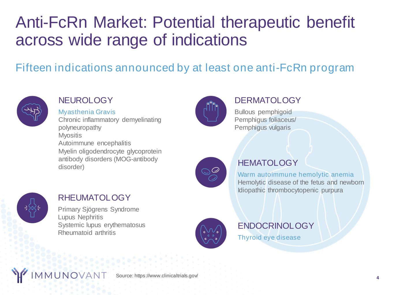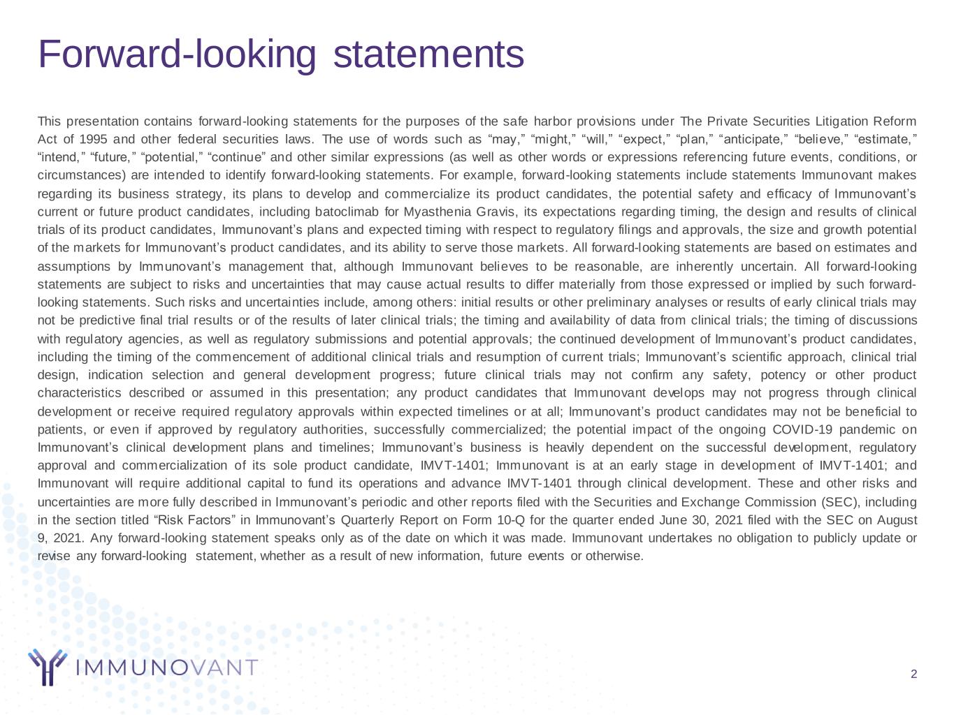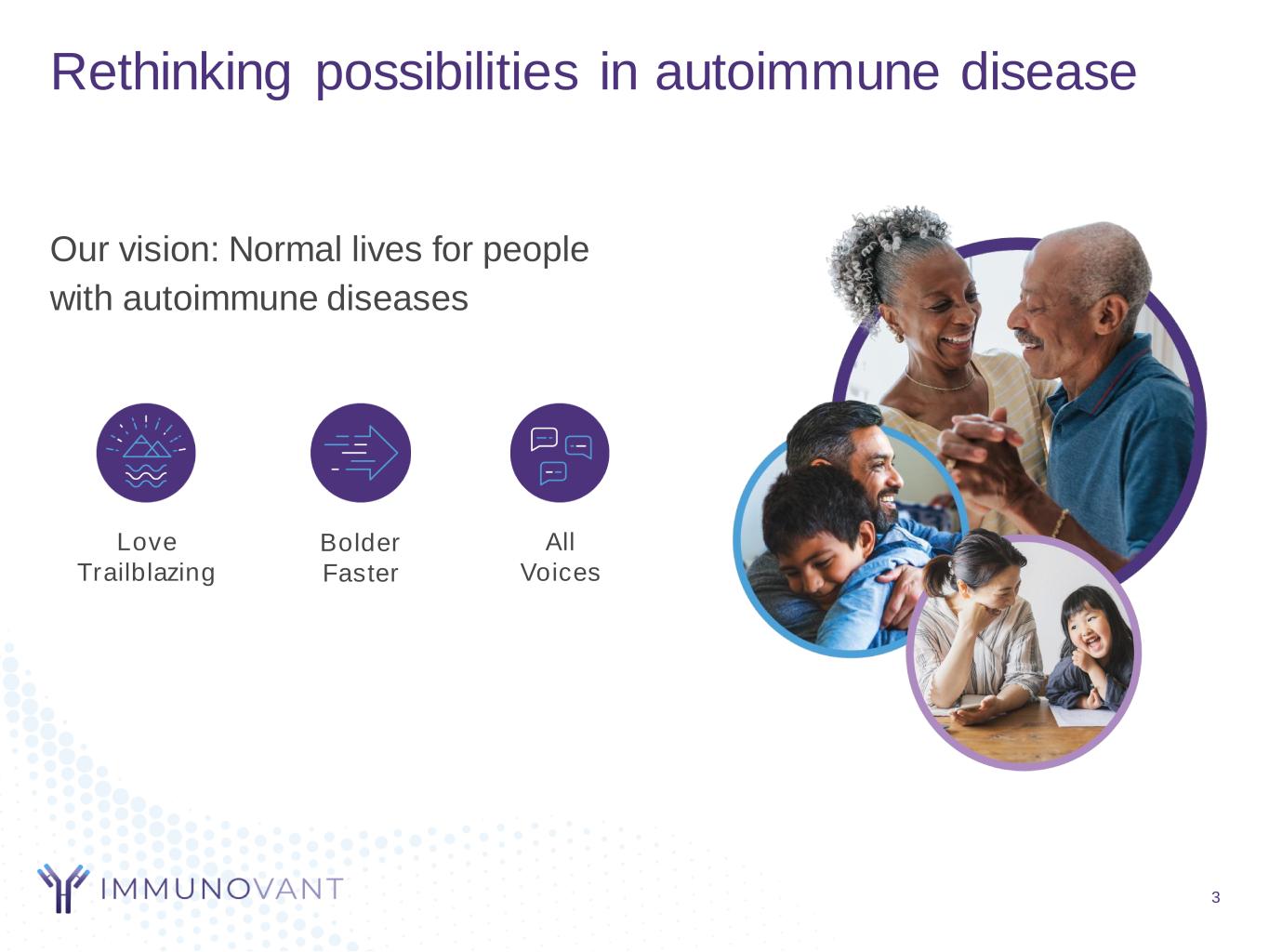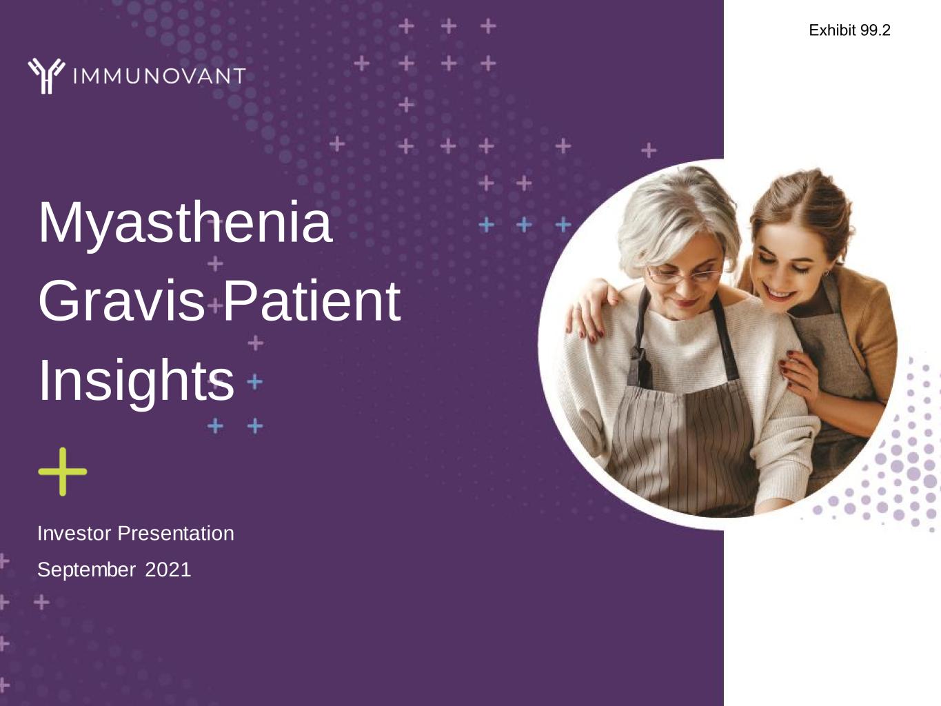 Forward-looking statements 2 This presentation contains forward-looking statements for the purposes of the safe harbor provisions under The Private Securities Litigation Reform Act of 1995 and other federal securities laws. The use of words such as “may,” “might,” “will,” “expect,” “plan,” “anticipate,” “believe,” “estimate,” “intend,” “future,” “potential,” “continue” and other similar expressions (as well as other words or expressions referencing future events, conditions, or circumstances) are intended to identify forward-looking statements. For example, forward-looking statements include statements Immunovant makes regarding its business strategy, its plans to develop and commercialize its product candidates, the potential safety and efficacy of Immunovant’s current or future product candidates, including batoclimab for Myasthenia Gravis, its expectations regarding timing, the design and results of clinical trials of its product candidates, Immunovant’s plans and expected timing with respect to regulatory filings and approvals, the size and growth potential of the markets for Immunovant’s product candidates, and its ability to serve those markets. All forward-looking statements are based on estimates and assumptions by Immunovant’s management that, although Immunovant believes to be reasonable, are inherently uncertain. All forward-looking statements are subject to risks and uncertainties that may cause actual results to differ materially from those expressed or implied by such forward- looking statements. Such risks and uncertainties include, among others: initial results or other preliminary analyses or results of early clinical trials may not be predictive final trial results or of the results of later clinical trials; the timing and availability of data from clinical trials; the timing of discussions with regulatory agencies, as well as regulatory submissions and potential approvals; the continued development of Immunovant’s product candidates, including the timing of the commencement of additional clinical trials and resumption of current trials; Immunovant’s scientific approach, clinical trial design, indication selection and general development progress; future clinical trials may not confirm any safety, potency or other product characteristics described or assumed in this presentation; any product candidates that Immunovant develops may not progress through clinical development or receive required regulatory approvals within expected timelines or at all; Immunovant’s product candidates may not be beneficial to patients, or even if approved by regulatory authorities, successfully commercialized; the potential impact of the ongoing COVID-19 pandemic on Immunovant’s clinical development plans and timelines; Immunovant’s business is heavily dependent on the successful development, regulatory approval and commercialization of its sole product candidate, IMVT-1401; Immunovant is at an early stage in development of IMVT-1401; and Immunovant will require additional capital to fund its operations and advance IMVT-1401 through clinical development. These and other risks and uncertainties are more fully described in Immunovant’s periodic and other reports filed with the Securities and Exchange Commission (SEC), including in the section titled “Risk Factors” in Immunovant’s Quarterly Report on Form 10-Q for the quarter ended June 30, 2021 filed with the SEC on August 9, 2021. Any forward-looking statement speaks only as of the date on which it was made. Immunovant undertakes no obligation to publicly update or revise any forward-looking statement, whether as a result of new information, future events or otherwise.