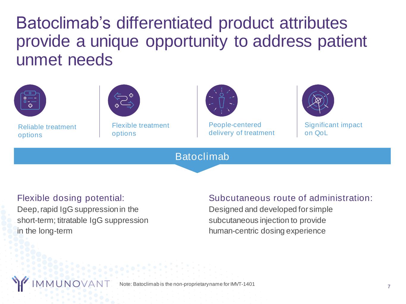 Batoclimab’s differentiated product attributes provide a unique opportunity to address patient unmet needs 7 Subcutaneous route of administration: Designed and developed for simple subcutaneous injection to provide human-centric dosing experience Significant impact on QoL Reliable treatment options Flexible treatment options People-centered delivery of treatment Flexible dosing potential: Deep, rapid IgG suppression in the short-term; titratable IgG suppression in the long-term Batoclimab Note: Batoclimab is the non-proprietary name for IMVT-1401