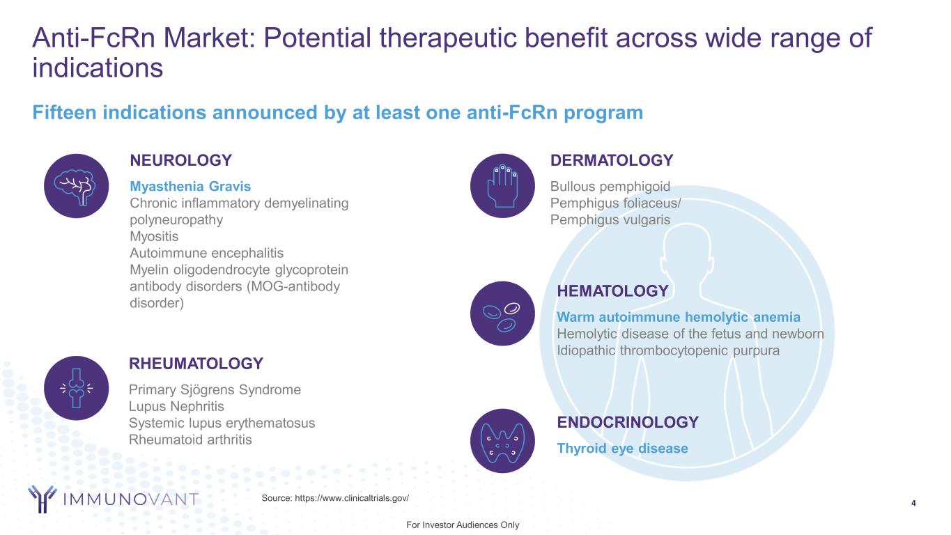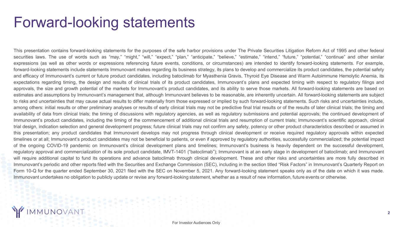 Forward-looking statements 2 This presentation contains forward-looking statements for the purposes of the safe harbor provisions under The Private Securities Litigation Reform Act of 1995 and other federal securities laws. The use of words such as “may,” “might,” “will,” “expect,” “plan,” “anticipate,” “believe,” “estimate,” “intend,” “future,” “potential,” “continue” and other similar expressions (as well as other words or expressions referencing future events, conditions, or circumstances) are intended to identify forward-looking statements. For example, forward-looking statements include statements Immunovant makes regarding its business strategy, its plans to develop and commercialize its product candidates, the potential safety and efficacy of Immunovant’s current or future product candidates, including batoclimab for Myasthenia Gravis, Thyroid Eye Disease and Warm Autoimmune Hemolytic Anemia, its expectations regarding timing, the design and results of clinical trials of its product candidates, Immunovant’s plans and expected timing with respect to regulatory filings and approvals, the size and growth potential of the markets for Immunovant’s product candidates, and its ability to serve those markets. All forward-looking statements are based on estimates and assumptions by Immunovant’s management that, although Immunovant believes to be reasonable, are inherently uncertain. All forward-looking statements are subject to risks and uncertainties that may cause actual results to differ materially from those expressed or implied by such forward-looking statements. Such risks and uncertainties include, among others: initial results or other preliminary analyses or results of early clinical trials may not be predictive final trial results or of the results of later clinical trials; the timing and availability of data from clinical trials; the timing of discussions with regulatory agencies, as well as regulatory submissions and potential approvals; the continued development of Immunovant’s product candidates, including the timing of the commencement of additional clinical trials and resumption of current trials; Immunovant’s scientific approach, clinical trial design, indication selection and general development progress; future clinical trials may not confirm any safety, potency or other product characteristics described or assumed in this presentation; any product candidates that Immunovant develops may not progress through clinical development or receive required regulatory approvals within expected timelines or at all; Immunovant’s product candidates may not be beneficial to patients, or even if approved by regulatory authorities, successfully commercialized; the potential impact of the ongoing COVID-19 pandemic on Immunovant’s clinical development plans and timelines; Immunovant’s business is heavily dependent on the successful development, regulatory approval and commercialization of its sole product candidate, IMVT-1401 (“batoclimab”); Immunovant is at an early stage in development of batoclimab; and Immunovant will require additional capital to fund its operations and advance batoclimab through clinical development. These and other risks and uncertainties are more fully described in Immunovant’s periodic and other reports filed with the Securities and Exchange Commission (SEC), including in the section titled “Risk Factors” in Immunovant’s Quarterly Report on Form 10-Q for the quarter ended September 30, 2021 filed with the SEC on November 5, 2021. Any forward-looking statement speaks only as of the date on which it was made. Immunovant undertakes no obligation to publicly update or revise any forward-looking statement, whether as a result of new information, future events or otherwise. For Investor Audiences Only