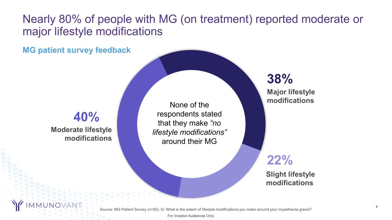 People with MG recognize limitations of current therapies, which keep them from living their normal lives Historical standards of care have important limitations Episodic or cyclical treatment – especially steroids and IvIg Prolonged time to onset for other immunosuppressants Potential trade-offs to achieve therapeutic benefit Potential safety concerns Some invasive with burdensome route of administration As medications adjusted, anxiety about flares remain Desire confidence in ability to sustain an adequate response Fear of flare may limit patients’ outlook of the future 6 MG patient research feedback For Investor Audiences Only