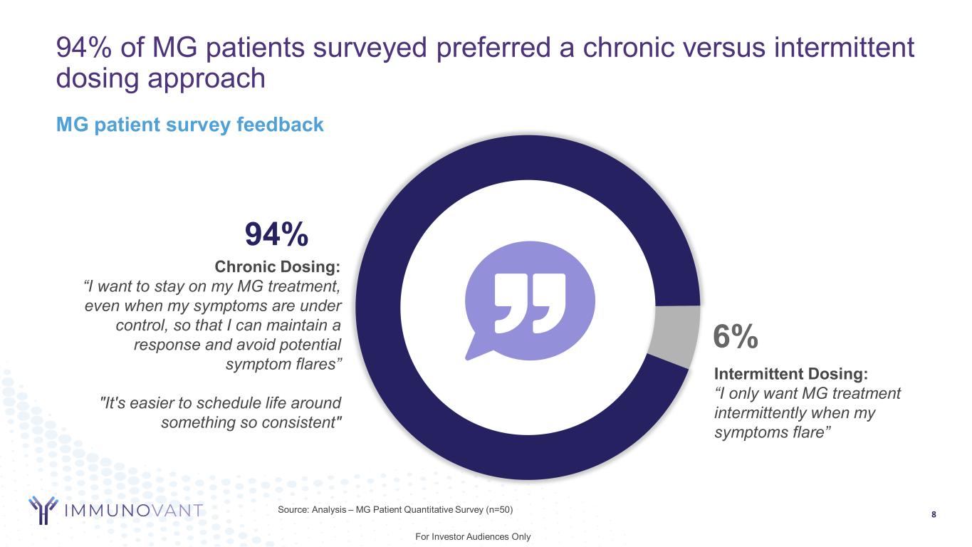 7 Nearly 80% of people with MG (on treatment) reported moderate or major lifestyle modifications 7 Source: MG Patient Survey (n=50). Q: What is the extent of lifestyle modifications you make around your myasthenia gravis? Slight lifestyle modifications Major lifestyle modifications Moderate lifestyle modifications 38% None of the respondents stated that they make “no lifestyle modifications” around their MG 22% 40% MG patient survey feedback For Investor Audiences Only