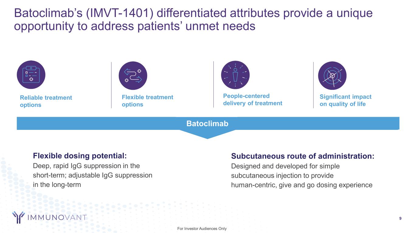 Batoclimab’s (IMVT-1401) differentiated attributes provide a unique opportunity to address patients’ unmet needs 9 Subcutaneous route of administration: Designed and developed for simple subcutaneous injection to provide human-centric, give and go dosing experience Significant impact on quality of life Reliable treatment options Flexible treatment options People-centered delivery of treatment Flexible dosing potential: Deep, rapid IgG suppression in the short-term; adjustable IgG suppression in the long-term Batoclimabli For Investor Audiences Only