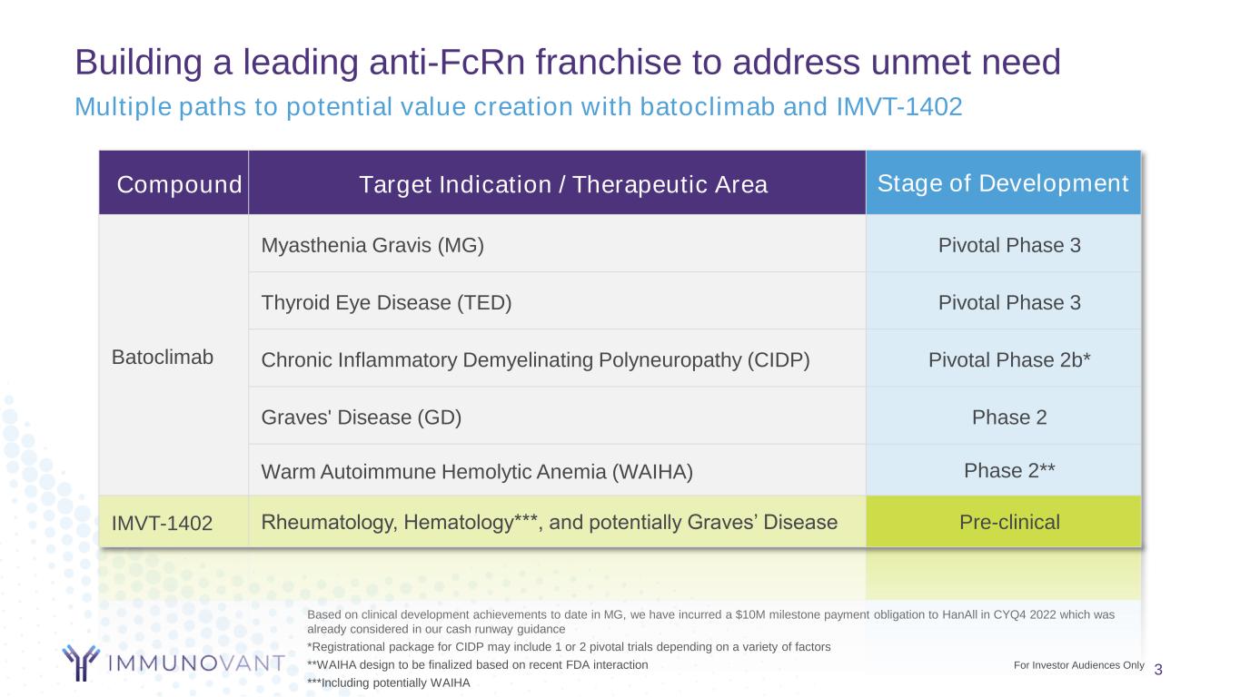 Forward-looking statements 2 This presentation contains forward-looking statements for the purposes of the safe harbor provisions under The Private Securities Litigation Reform Act of 1995 and other federal securities laws. The use of words such as "can," “may,” “might,” “will,” “would,” “should,” “expect,” “believe,” “estimate,” “design,” “plan,” "intend," and other similar expressions are intended to identify forward-looking statements. Such forward looking statements include Immunovant’s expectations regarding patient enrollment, timing, design, and results of clinical trials of its product candidates and indication selections; Immunovant's plan to develop batoclimab and IMVT-1402 across a broad range of autoimmune indications; expectations with respect to the safety and monitoring plan and size of the safety database for these planned clinical trials; the timing of discussions with regulatory agencies; the size and growth of the potential markets for Immunovant's product candidates and indication selections; Immunovant’s plan to explore in subsequent study periods follow-on treatment with alternative dosing regimens; Immunovant's expectations regarding its cash runway; Immunovant's beliefs regarding the potential benefits of batoclimab’s and IMVT-1402's unique product attributes; and Immunovant's expectations regarding the issuance and term of any pending patents. All forward-looking statements are based on estimates and assumptions by Immunovant’s management that, although Immunovant believes to be reasonable, are inherently uncertain. All forward-looking statements are subject to risks and uncertainties that may cause actual results to differ materially from those that Immunovant expected. Such risks and uncertainties include, among others: initial results or other preliminary analyses or results of early clinical trials may not be predictive of final trial results or of the results of later clinical trials; results of animal studies may not be predictive of results in humans; the timing and availability of data from clinical trials; the timing of discussions with regulatory agencies, as well as regulatory submissions and potential approvals; the continued development of Immunovant’s product candidates, including the timing of the commencement of additional clinical trials and resumption of current trials; Immunovant’s scientific approach, clinical trial design, indication selection, and general development progress; future clinical trials may not confirm any safety, potency, or other product characteristics described or assumed in this presentation; any product candidate that Immunovant develops may not progress through clinical development or receive required regulatory approvals within expected timelines or at all; Immunovant's pending composition of matter patent for IMVT-1402 may not be issued; Immunovant’s product candidates may not be beneficial to patients, or even if approved by regulatory authorities, successfully commercialized; the potential impact of the ongoing COVID-19 pandemic, geopolitical tensions, and adverse macroeconomic conditions on Immunovant’s clinical development plans and timelines; Immunovant’s business is heavily dependent on the successful development, regulatory approval and commercialization of batoclimab and IMVT-1402; Immunovant is at an early stage in development for IMVT-1402 and in various stages of clinical development for batoclimab; and Immunovant will require additional capital to fund its operations and advance batoclimab and IMVT-1402 through clinical development. These and other risks and uncertainties are more fully described in Immunovant’s periodic and other reports filed with the Securities and Exchange Commission (SEC), including in the section titled “Risk Factors” in Immunovant’s most recent Annual Report on Form 10-K, its Form 10-Q filed with the SEC on November 4, 2022, and Immunovant’s subsequent filings with the SEC. Any forward-looking statement speaks only as of the date on which it was made. Immunovant undertakes no obligation to publicly update or revise any forward-looking statement, whether as a result of new information, future events or otherwise. All trademarks, trade names, service marks, and copyrights appearing in this presentation are the property of their respective owners. Dates used in this presentation refer to the applicable calendar year unless otherwise noted. No clinical head-to-head comparisons of Immunovant product candidates and third party anti-FcRn assets has been conducted. For Investor Audiences Only