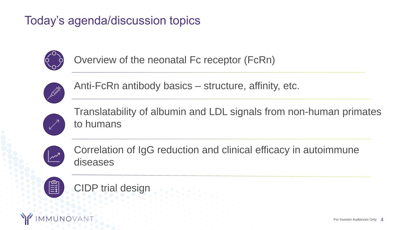 Building a leading anti-FcRn franchise to address unmet need 3 Multiple paths to potential value creation with batoclimab and IMVT-1402 Based on clinical development achievements to date in MG, we have incurred a $10M milestone payment obligation to HanAll in CYQ4 2022 which was already considered in our cash runway guidance *Registrational package for CIDP may include 1 or 2 pivotal trials depending on a variety of factors **WAIHA design to be finalized based on recent FDA interaction ***Including potentially WAIHA Compound Target Indication / Therapeutic Area Stage of Development Batoclimab Myasthenia Gravis (MG) Pivotal Phase 3 Thyroid Eye Disease (TED) Pivotal Phase 3 Chronic Inflammatory Demyelinating Polyneuropathy (CIDP) Pivotal Phase 2b* Graves' Disease (GD) Phase 2 Warm Autoimmune Hemolytic Anemia (WAIHA) Phase 2** IMVT-1402 Rheumatology, Hematology***, and potentially Graves’ Disease Pre-clinical For Investor Audiences Only