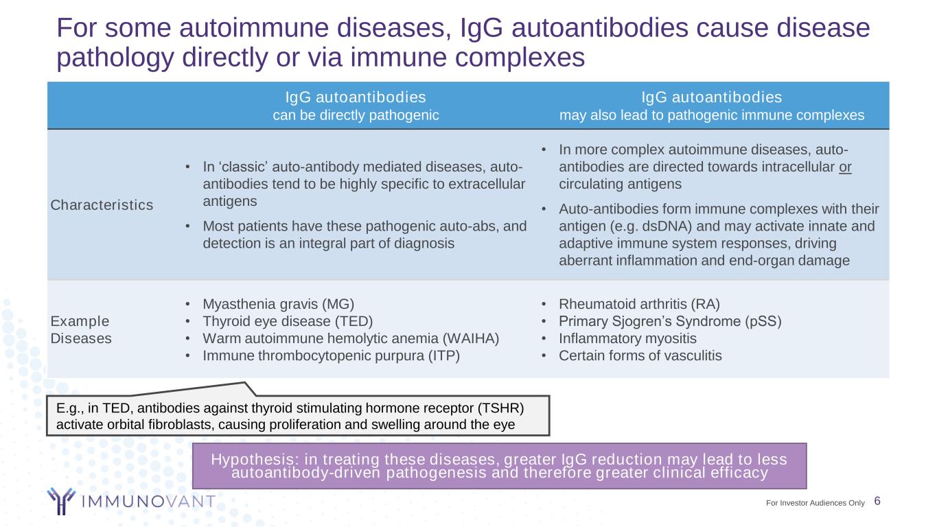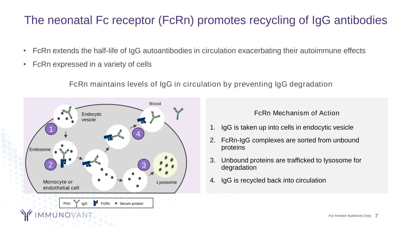 For some autoimmune diseases, IgG autoantibodies cause disease pathology directly or via immune complexes IgG autoantibodies can be directly pathogenic IgG autoantibodies may also lead to pathogenic immune complexes Characteristics • In ‘classic’ auto-antibody mediated diseases, auto- antibodies tend to be highly specific to extracellular antigens • Most patients have these pathogenic auto-abs, and detection is an integral part of diagnosis • In more complex autoimmune diseases, auto- antibodies are directed towards intracellular or circulating antigens • Auto-antibodies form immune complexes with their antigen (e.g. dsDNA) and may activate innate and adaptive immune system responses, driving aberrant inflammation and end-organ damage Example Diseases • Myasthenia gravis (MG) • Thyroid eye disease (TED) • Warm autoimmune hemolytic anemia (WAIHA) • Immune thrombocytopenic purpura (ITP) • Rheumatoid arthritis (RA) • Primary Sjogren’s Syndrome (pSS) • Inflammatory myositis • Certain forms of vasculitis E.g., in TED, antibodies against thyroid stimulating hormone receptor (TSHR) activate orbital fibroblasts, causing proliferation and swelling around the eye Hypothesis: in treating these diseases, greater IgG reduction may lead to less autoantibody-driven pathogenesis and therefore greater clinical efficacy 6For Investor Audiences Only