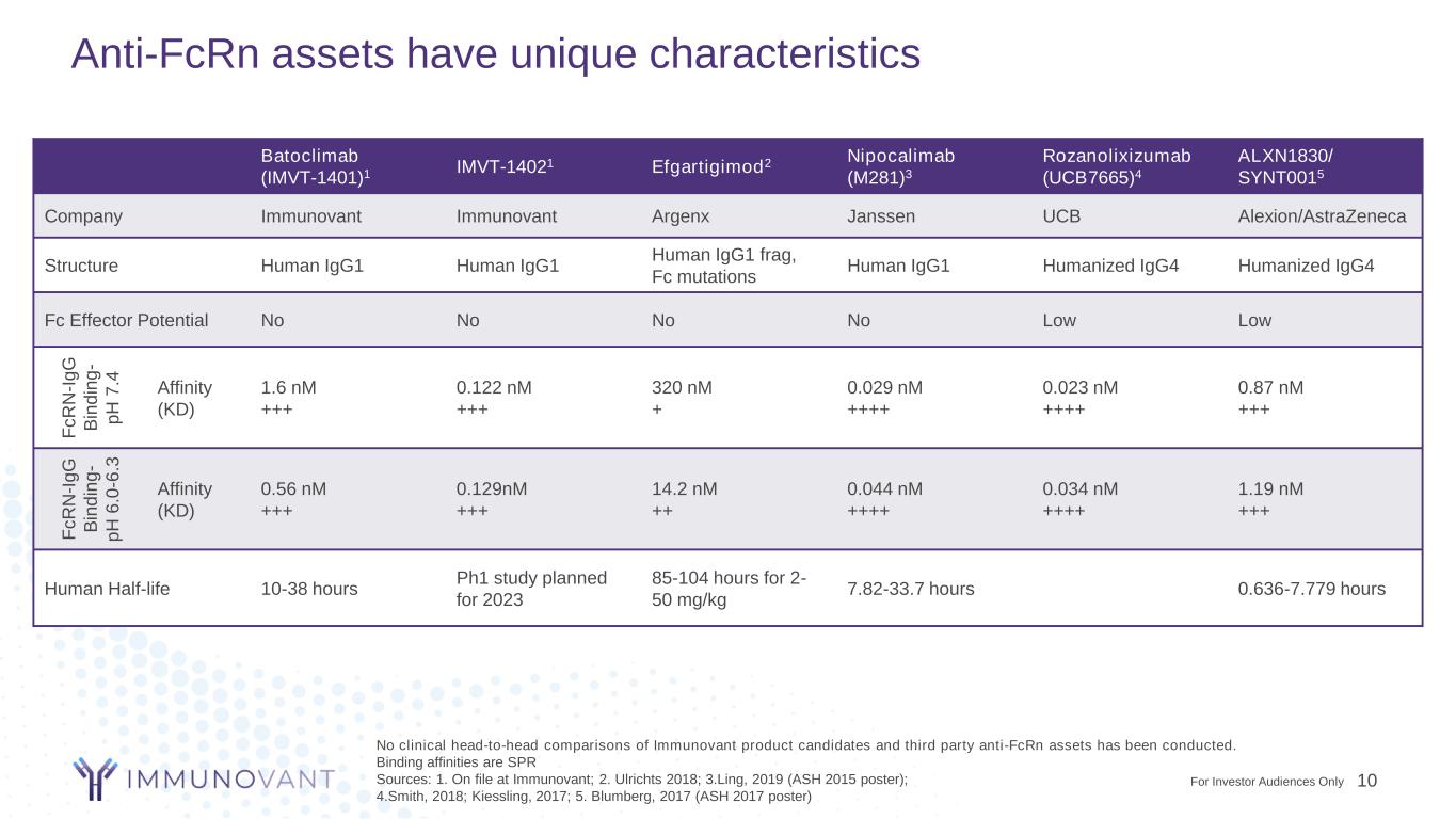 Anti-FcRn assets have unique characteristics No clinical head-to-head comparisons of Immunovant product candidates and third party anti-FcRn assets has been conducted. Binding affinities are SPR Sources: 1. On file at Immunovant; 2. Ulrichts 2018; 3.Ling, 2019 (ASH 2015 poster); 4.Smith, 2018; Kiessling, 2017; 5. Blumberg, 2017 (ASH 2017 poster) Batoclimab (IMVT-1401)1 IMVT-14021 Efgartigimod2 Nipocalimab (M281)3 Rozanolixizumab (UCB7665)4 ALXN1830/ SYNT0015 Company Immunovant Immunovant Argenx Janssen UCB Alexion/AstraZeneca Structure Human IgG1 Human IgG1 Human IgG1 frag, Fc mutations Human IgG1 Humanized IgG4 Humanized IgG4 Fc Effector Potential No No No No Low Low F c R N -I g G B in d in g - p H 7 .4 Affinity (KD) 1.6 nM +++ 0.122 nM +++ 320 nM + 0.029 nM ++++ 0.023 nM ++++ 0.87 nM +++ F c R N -I g G B in d in g - p H 6 .0 -6 .3 Affinity (KD) 0.56 nM +++ 0.129nM +++ 14.2 nM ++ 0.044 nM ++++ 0.034 nM ++++ 1.19 nM +++ Human Half-life 10-38 hours Ph1 study planned for 2023 85-104 hours for 2- 50 mg/kg 7.82-33.7 hours 0.636-7.779 hours 10For Investor Audiences Only