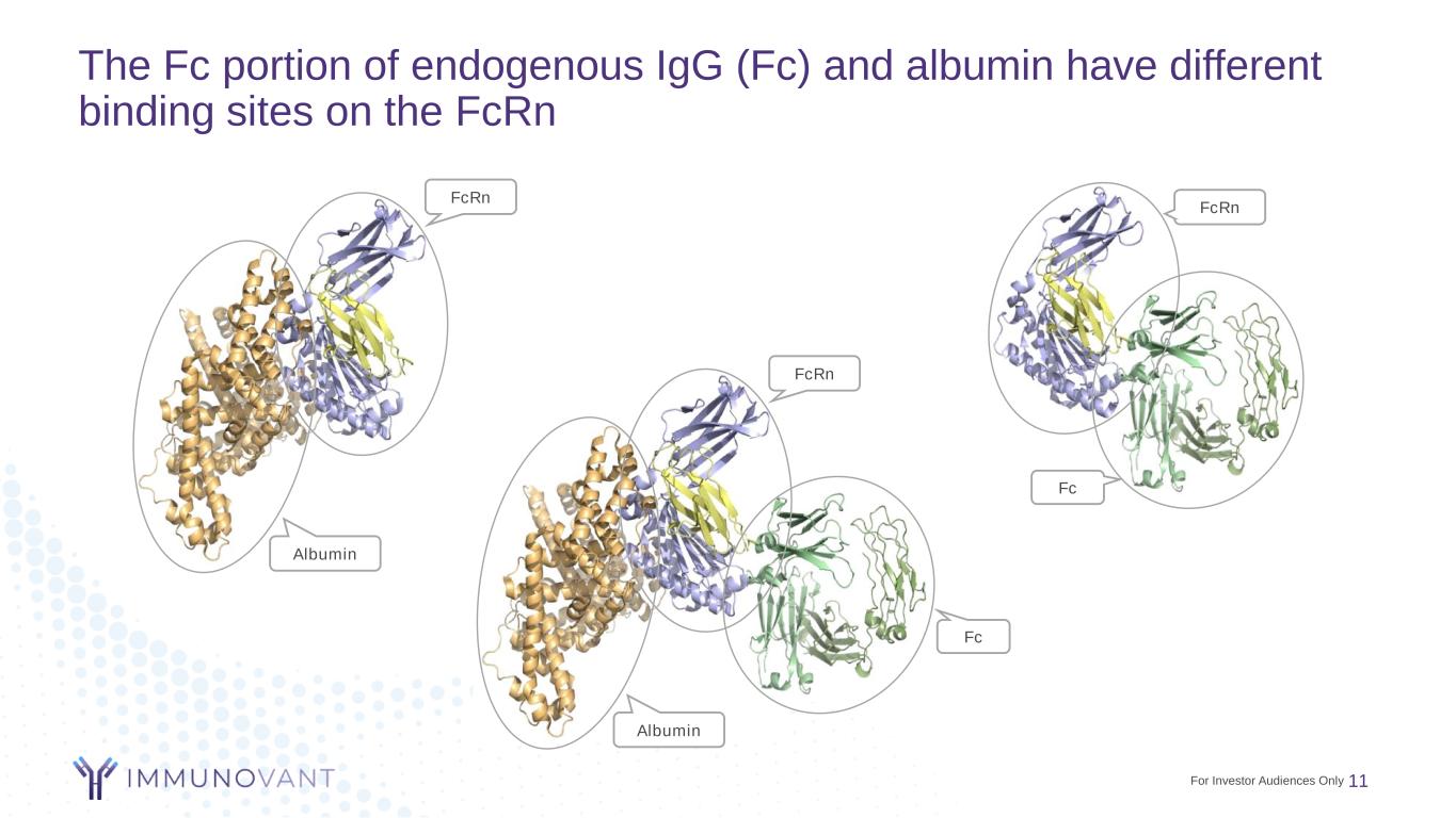 The Fc portion of endogenous IgG (Fc) and albumin have different binding sites on the FcRn 11 Albumin FcRn Fc FcRn Albumin FcRn Fc For Investor Audiences Only