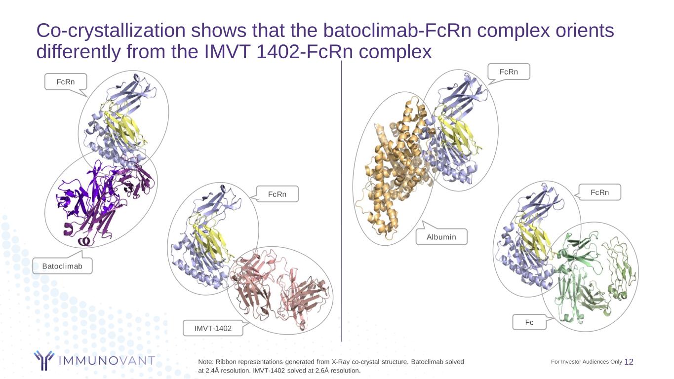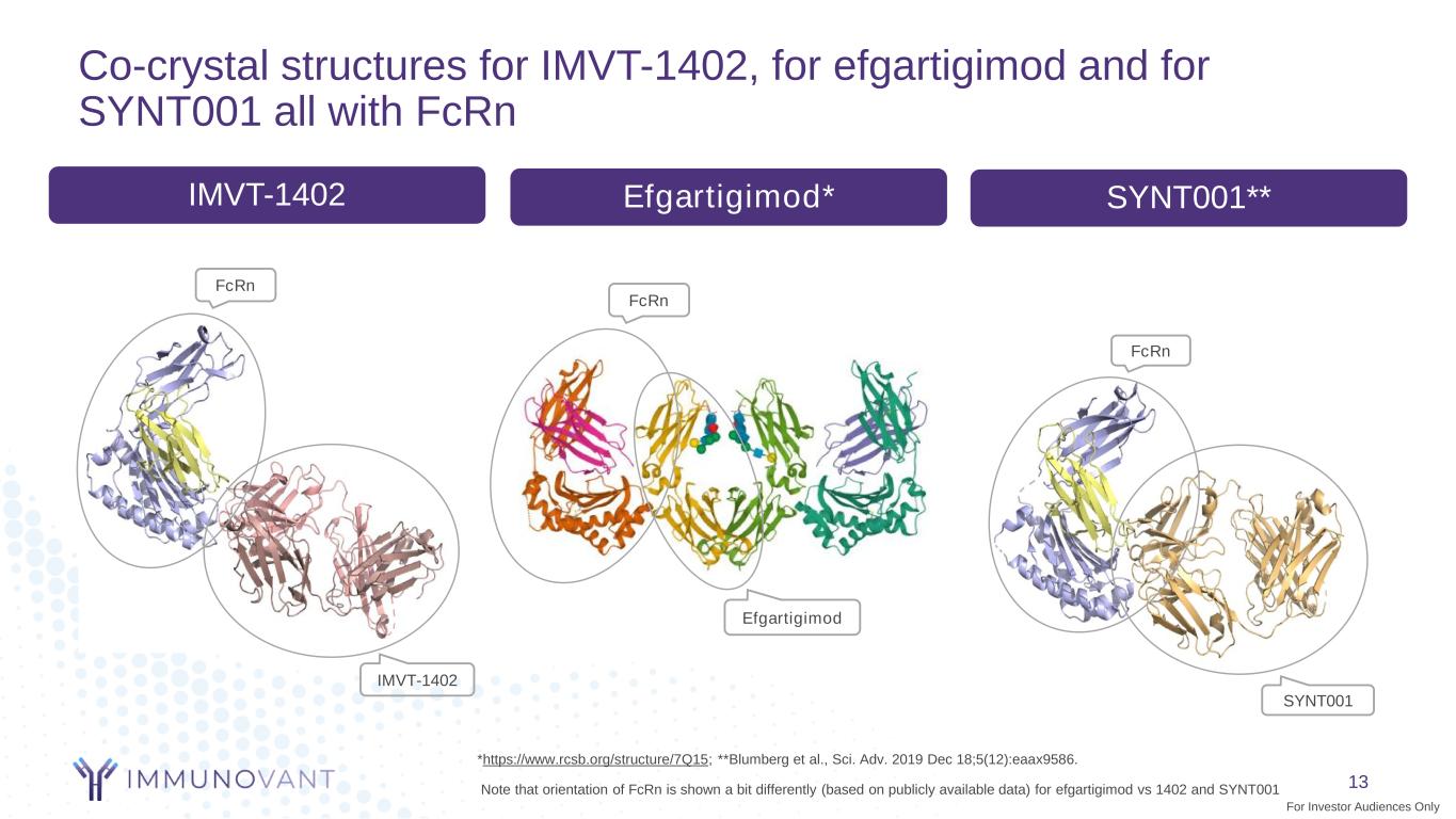 Co-crystallization shows that the batoclimab-FcRn complex orients differently from the IMVT 1402-FcRn complex 12Note: Ribbon representations generated from X-Ray co-crystal structure. Batoclimab solved at 2.4Å resolution. IMVT-1402 solved at 2.6Å resolution. Batoclimab FcRn FcRn IMVT-1402 Albumin FcRn Fc FcRn For Investor Audiences Only