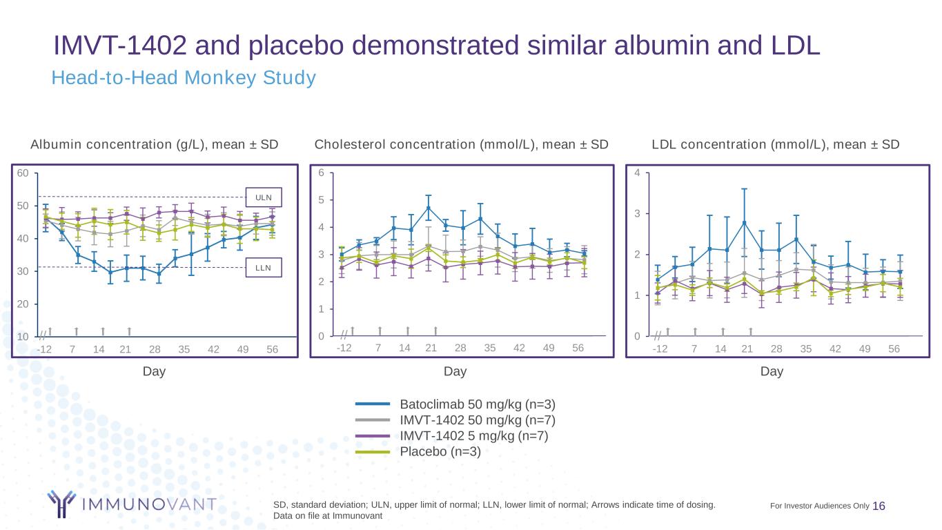 16 IMVT-1402 and placebo demonstrated similar albumin and LDL Day SD, standard deviation; ULN, upper limit of normal; LLN, lower limit of normal; Arrows indicate time of dosing. Data on file at Immunovant Day Batoclimab 50 mg/kg (n=3) IMVT-1402 50 mg/kg (n=7) IMVT-1402 5 mg/kg (n=7) Placebo (n=3) LDL concentration (mmol/L), mean ± SDAlbumin concentration (g/L), mean ± SD -12 7 14 21 28 35 42 49 56 0 1 2 3 4 //10 20 30 40 50 60 ULN LLN -12 7 14 21 28 35 42 49 56 // Head-to-Head Monkey Study Day -12 7 14 21 28 35 42 49 56 // Cholesterol concentration (mmol/L), mean ± SD 0 1 2 3 4 5 6 For Investor Audiences Only