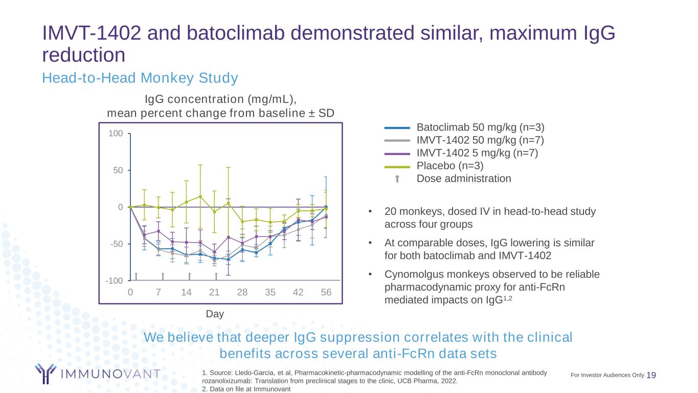Impact on albumin observed in non-human primates has been highly translatable to humans 17 1. Ulrichts P.J Clin Invest. 2018 Oct 1;128(10):4372-4386 2. Efgartigimod EMA assessment report - EMA/641081/2022 3. Efgartigimod FDA integrated review - 761195Orig1s000 4. Blumberg LJ. Sci Adv. 2019 Dec 18;5(12):eaax9586 5. Stifel research note – Momenta Pharmaceuticals, December 18, 2018 Evidence of translatability observed across multiple anti-FcRn agents 6. Ling et.al, Clin Pharmacol Ther. 2019 Apr;105(4):1031-1039. 7. Momenta Investor Presentation – June 15, 2020 8. Smith B, MAbs. 2018 Oct;10(7):1111-1130 9. Kiessling P. Sci Transl Med. 2017 Nov 1;9(414):eaan1208 Product (Company) Impact on Albumin Levels from Baseline Cynomolgus Monkeys Clinical Data Efgartigimod (Argenx) • Reported no impact on albumin homeostasis1 • EMA public assessment report indicates that there was no impact on albumin levels across doses2 • Phase 1 reported multiple doses had no impact on albumin levels in humans1 • Phase 3 pivotal trials did not identify a safety signal of hypoalbuminemia3 SYNT-001 (Syntimmune) • Reported no difference in albumin levels from baseline for vehicle, 10, 30, or 100mg/kg4 • Phase 1 data showed no difference in albumin levels from baseline following a single dose of vehicle, 1, 3, 10, or 30mg/kg4 Nipocalimab (Momenta / J&J) • Data not published • Momenta management’s public commentary indicated that albumin reductions were seen in MAD studies in cynomolgus monkeys5 • Phase 1 reported reductions in albumin levels from baseline at 15 and 30mg/kg doses6 • Phase 2 showed reductions in albumin levels from baseline at 30 and 60mg/kg7 Rozanolixizumab (UCB) • Reported small reductions (1-13%) in albumin levels from baseline8 • Phase 1 reported a small decrease in albumin levels from baseline for both IV and SC (1-5%)9 Batoclimab (Immunovant) • Observed consistent reduction in albumin levels from baseline • Observed dose dependent decreases in albumin levels from baseline IMVT-1402 (Immunovant) • No or mininal impact on albumin levels observed from baseline (variability same as placebo) • Initial Phase 1 data available in mid-2023 For Investor Audiences Only