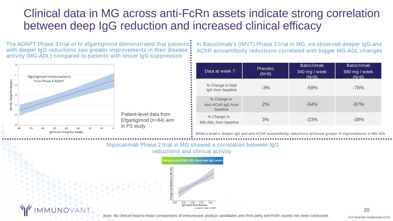 -100 -50 0 50 100 0 7 14 21 28 35 42 56 • 20 monkeys, dosed IV in head-to-head study across four groups • At comparable doses, IgG lowering is similar for both batoclimab and IMVT-1402 • Cynomolgus monkeys observed to be reliable pharmacodynamic proxy for anti-FcRn mediated impacts on IgG1,2 IMVT-1402 and batoclimab demonstrated similar, maximum IgG reduction 19 IgG concentration (mg/mL), mean percent change from baseline ± SD Day 1. Source: Lledo-Garcia, et al, Pharmacokinetic-pharmacodynamic modelling of the anti-FcRn monoclonal antibody rozanolixizumab: Translation from preclinical stages to the clinic, UCB Pharma, 2022. 2. Data on file at Immunovant Batoclimab 50 mg/kg (n=3) IMVT-1402 50 mg/kg (n=7) IMVT-1402 5 mg/kg (n=7) Placebo (n=3) Dose administration Head-to-Head Monkey Study We believe that deeper IgG suppression correlates with the clinical benefits across several anti-FcRn data sets For Investor Audiences Only