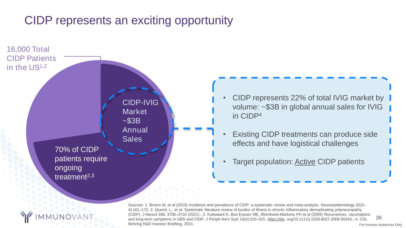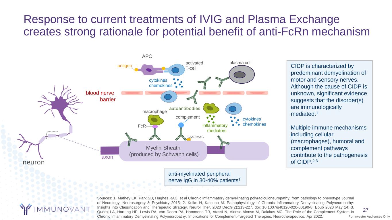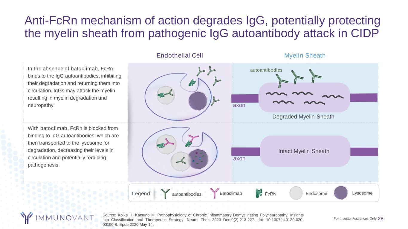 Response to current treatments of IVIG and Plasma Exchange creates strong rationale for potential benefit of anti-FcRn mechanism axon Myelin Sheath (produced by Schwann cells) anti-myelinated peripheral nerve IgG in 30-40% patients1 autoantibodies neuron CIDP is characterized by predominant demyelination of motor and sensory nerves. Although the cause of CIDP is unknown, significant evidence suggests that the disorder(s) are immunologically mediated.1 Multiple immune mechanisms including cellular (macrophages), humoral and complement pathways contribute to the pathogenesis of CIDP.2,3 C5b-9MAC complement FcR plasma cell macrophage blood nerve barrier activated T-cell cytokines chemokinesinflammatory mediators APC antigen cytokines chemokines ’ Sources: 1. Mathey EK, Park SB, Hughes RAC, et al Chronic inflammatory demyelinating polyradiculoneuropathy: from pathology to phenotype Journal of Neurology, Neurosurgery & Psychiatry 2015; 2. Koike H, Katsuno M. Pathophysiology of Chronic Inflammatory Demyelinating Polyneuropathy: Insights into Classification and Therapeutic Strategy. Neurol Ther. 2020 Dec;9(2):213-227. doi: 10.1007/s40120-020-00190-8. Epub 2020 May 14; 3. Querol LA, Hartung HP, Lewis RA, van Doorn PA, Hammond TR, Atassi N, Alonso-Alonso M, Dalakas MC. The Role of the Complement System in Chronic Inflammatory Demyelinating Polyneuropathy: Implications for Complement-Targeted Therapies. Neurotherapeutics. Apr 2022. 27 For Investor Audiences Only