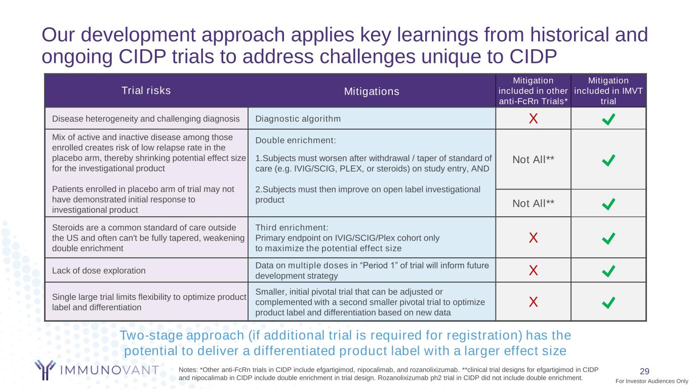 Anti-FcRn mechanism of action degrades IgG, potentially protecting the myelin sheath from pathogenic IgG autoantibody attack in CIDP 28 Endothelial Cell Myelin Sheath In the absence of batoclimab, FcRn binds to the IgG autoantibodies, inhibiting their degradation and returning them into circulation. IgGs may attack the myelin resulting in myelin degradation and neuropathy With batoclimab, FcRn is blocked from binding to IgG autoantibodies, which are then transported to the lysosome for degradation, decreasing their levels in circulation and potentially reducing pathogenesis autoantibodies Batoclimab FcRNLegend: axon Degraded Myelin Sheath axon Intact Myelin Sheath Lysosome autoantibodies Endosome Source: Koike H, Katsuno M. Pathophysiology of Chronic Inflammatory Demyelinating Polyneuropathy: Insights into Classification and Therapeutic Strategy. Neurol Ther. 2020 Dec;9(2):213-227. doi: 10.1007/s40120-020- 00190-8. Epub 2020 May 14. For Investor Audiences Only