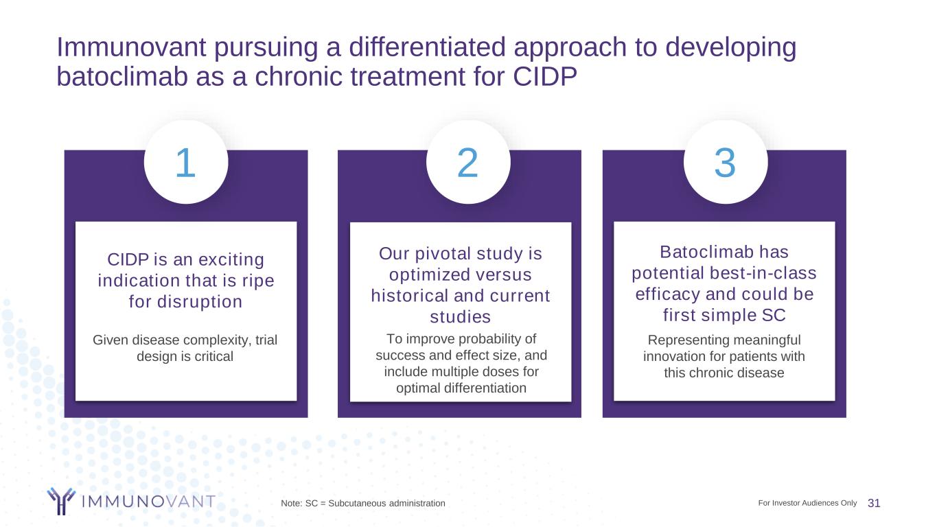 CIDP pivotal Phase 2b trial design intended to enable development of potentially best-in-anti-FcRn-class chronic therapy for CIDP A: Cohorts are defined by CIDP treatment at Screening., B: Participants who fail to worsen by Week 0 will be withdrawn from the study at Week 0., C: Period 1 Non-Responders who complete Period 1 will be withdrawn from the study after completing Week 12 and the subsequent 4-week Follow-Up visit. Period 1 Non-Responders who require protocol-prohibited rescue therapy prior to Week 12 will discontinue IMP and may return to standard of care; these participants will be encouraged to remain in the study for Safety Follow-Up through Week 12 and the Follow-Up Visit., D: Participants that relapse in Period 2 or complete Period 2 without relapse will be eligible for participation in the Long-Term Extension study. Acronyms: CIDP= Chronic Inflammatory Demyelinating Polyneuropathy; EAN/PNS = European Academy of Neurology/Peripheral Nerve Society; Ig = immunoglobulin (IVIG and SCIG) therapy; IMP = investigational medicinal product; LTE = Long-term Extension; PLEX = plasma exchange; QW = every week; Wk = weekly; SC = subcutaneously; INCAT = Inflammatory Neuropathy Cause and Treatment Two dose regimens Period 1C: Randomized Treatment (12 weeks) Cohorts A (n=100): Randomize participants who worsen Cohort B: Same as A Cohort C: Randomize all Placebo-controlled Period 2D: Randomized Withdrawal (24 weeks) Placebo QW SC340mg batoclimab QW SC 680mg batoclimab QW SC 340mg batoclimab QW SC Efficacy analysis based on relapse (adjusted INCAT) Primary endpoint: proportion remaining relapse free by the end of period 2 for patients receiving Ig or PLEX at time of screening (Cohort A) Period 2 followed by LTE; 680mg QW x 4 for period 2 relapsers R a n d o m iz e T re a tm e n t R e s p o n d e rs ( 1 :1 ) 3 cohorts ScreeningA ≤ 28 days Cohort A Ig or PLEX Cohort B Corticosteroid Cohort C No treatment R a n d o m iz a ti o n ( 1 :1 ) Cohort A Stop Ig/PLEX Cohort B Taper corticosteroid Key selection criteria: Adult participants diagnosed per EAN/PNS CIDP guidelines, 2021 revision Week -12 Week 0 Week 12 analysis Week 36 analysis Study timeline Primary analysis only on Cohort A (IG/PLEX) WashoutB ≤ 12 weeks 30 For Investor Audiences Only