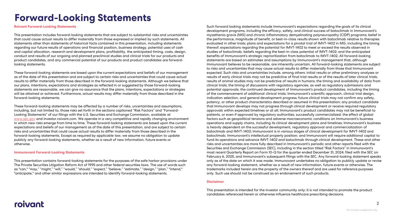 2 Forward-Looking Statements Roivant Forward-Looking Statements This presentation includes forward-looking statements that are subject to substantial risks and uncertainties that could cause actual results to differ materially from those expressed or implied by such statements. All statements other than statements of historical facts contained in this presentation, including statements regarding our future results of operations and financial position, business strategy, potential uses of cash and capital allocation, research and development plans, profitability, the anticipated timing, costs, design, conduct and results of our ongoing and planned preclinical studies and clinical trials for our products and product candidates, and any commercial potential of our products and product candidates are forward- looking statements. These forward-looking statements are based upon the current expectations and beliefs of our management as of the date of this presentation and are subject to certain risks and uncertainties that could cause actual results to differ materially from those described in the forward-looking statements. Although we believe that our plans, intentions, expectations and strategies as reflected in or suggested by those forward-looking statements are reasonable, we can give no assurance that the plans, intentions, expectations or strategies will be attained or achieved. Furthermore, actual results may differ materially from those described in the forward-looking statements. These forward-looking statements may be affected by a number of risks, uncertainties and assumptions, including, but not limited to, those risks set forth in the sections captioned “Risk Factors” and “Forward- Looking Statements” of our filings with the U.S. Securities and Exchange Commission, available at www.sec.gov and investor.roivant.com. We operate in a very competitive and rapidly changing environment in which new risks emerge from time to time. These forward-looking statements are based upon the current expectations and beliefs of our management as of the date of this presentation, and are subject to certain risks and uncertainties that could cause actual results to differ materially from those described in the forward-looking statements. Except as required by applicable law, we assume no obligation to update publicly any forward-looking statements, whether as a result of new information, future events or otherwise. Immunovant Forward-Looking Statements This presentation contains forward-looking statements for the purposes of the safe harbor provisions under The Private Securities Litigation Reform Act of 1995 and other federal securities laws. The use of words such as "can," “may,” “might,” “will,” “would,” “should,” “expect,” “believe,” “estimate,” “design,” “plan,” "intend," "anticipate," and other similar expressions are intended to identify forward-looking statements. Such forward looking statements include Immunovant’s expectations regarding the goals of its clinical development programs, including the efficacy, safety, and clinical success of batoclimab in Immunovant’s myasthenia gravis (MG) and chronic inflammatory demyelinating polyneuropathy (CIDP) programs; belief in the performance, magnitude of benefit, or best-in-class results shown with batoclimab relative to therapies evaluated in other trials; plans and expectations for a pivotal trial of IMVT-1402 in MG, including the timing thereof; expectations regarding the potential for IMVT-1402 to meet or exceed the results observed in studies of batoclimab; beliefs regarding the best-in-class potential of IMVT-1402; and the anticipated benefits of Immunovant’s strategic reprioritization from batoclimab to IMVT-1402. All forward-looking statements are based on estimates and assumptions by Immunovant’s management that, although Immunovant believes to be reasonable, are inherently uncertain. All forward-looking statements are subject to risks and uncertainties that may cause actual results to differ materially from those that Immunovant expected. Such risks and uncertainties include, among others: initial results or other preliminary analyses or results of early clinical trials may not be predictive of final trial results or of the results of later clinical trials; results of animal studies may not be predictive of results in humans; the timing and availability of data from clinical trials; the timing of discussions with regulatory agencies, as well as regulatory submissions and potential approvals; the continued development of Immunovant’s product candidates, including the timing of the commencement of additional clinical trials; Immunovant’s scientific approach, clinical trial design, indication selection, and general development progress; future clinical trials may not confirm any safety, potency, or other product characteristics described or assumed in this presentation; any product candidate that Immunovant develops may not progress through clinical development or receive required regulatory approvals within expected timelines or at all; Immunovant’s product candidates may not be beneficial to patients, or even if approved by regulatory authorities, successfully commercialized; the effect of global factors such as geopolitical tensions and adverse macroeconomic conditions on Immunovant’s business operations and supply chains, including its clinical development plans and timelines; Immunovant’s business is heavily dependent on the successful development, regulatory approval and commercialization of batoclimab and IMVT-1402; Immunovant is in various stages of clinical development for IMVT-1402 and batoclimab; Immunovant’s intellectual property position; and Immunovant will require additional capital to fund its operations and advance IMVT-1402 and batoclimab through clinical development. These and other risks and uncertainties are more fully described in Immunovant’s period