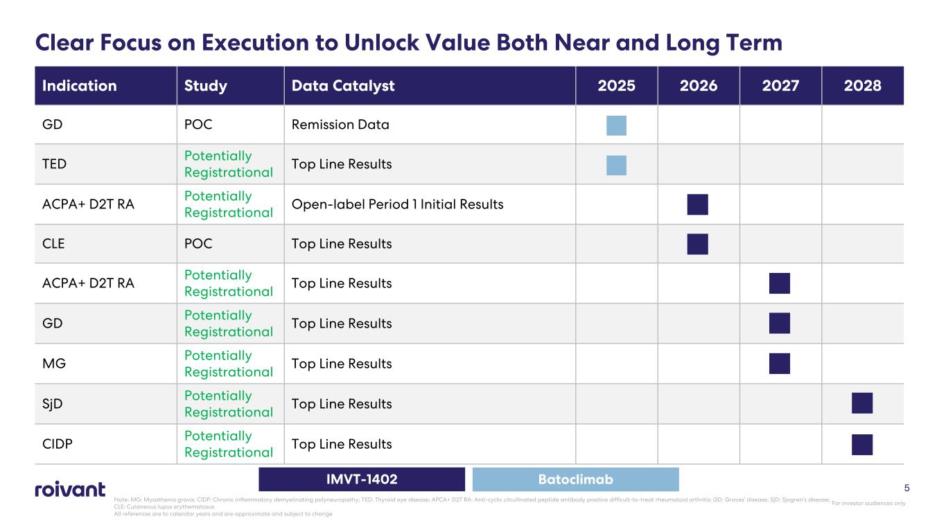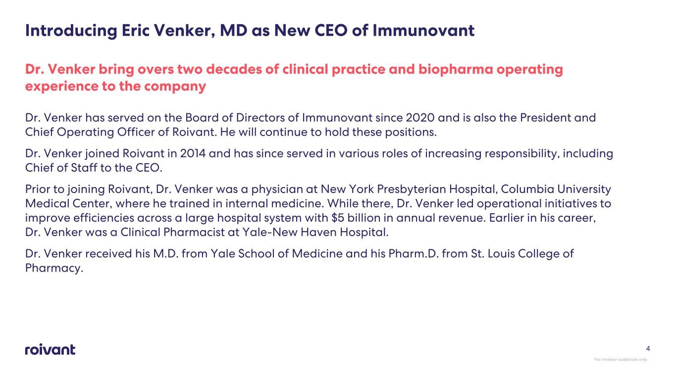 • Eric Venker, MD appointed CEO (President & COO of Roivant) • Tiago Girao appointed CFO (Former Telavant CFO) • Pete Salzmann, MD to remain as advisor following retirement 3 • Rapid clinical execution in potentially registrational studies for IMVT-1402 • Commercial planning for multiple potential upcoming 1402 launches • Careful allocation of resources and capital Strategic Focus (Next Leg)Management Transition • Sjögren’s Disease (SjD): IND cleared, potentially registrational trial starts Summer 2025 (potential for best-in-class profile) • Cutaneous Lupus Erythematosus (CLE): Concept study initiated (potential first-in-class; early positive data) • IMVT focused on executing in 6 announced indications currently underway (including SjD and CLE) IMVT-1402 Pipeline Update Immunovant: Driving the Next Phase of Growth with Roivant For investor audiences only Current cash balance provides runway for announced indications into Graves’ readout expected in 2027 with further broadening of indication set to be closely evaluated