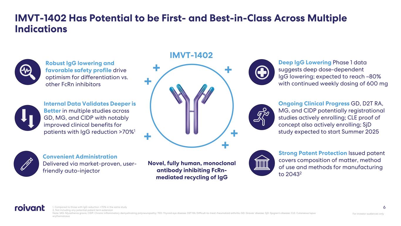 Clear Focus on Execution to Unlock Value Both Near and Long Term Indication Study Data Catalyst 2025 2026 2027 2028 GD POC Remission Data TED Potentially Registrational Top Line Results ACPA+ D2T RA Potentially Registrational Open-label Period 1 Initial Results CLE POC Top Line Results ACPA+ D2T RA Potentially Registrational Top Line Results GD Potentially Registrational Top Line Results MG Potentially Registrational Top Line Results SjD Potentially Registrational Top Line Results CIDP Potentially Registrational Top Line Results IMVT-1402 Batoclimab 5 For investor audiences only Note: MG: Myasthenia gravis; CIDP: Chronic inflammatory demyelinating polyneuropathy; TED: Thyroid eye disease; APCA+ D2T RA: Anti-cyclic citrullinated peptide antibody positive difficult-to-treat rheumatoid arthritis; GD: Graves’ disease; SjD: Sjogren’s disease; CLE: Cutaneous lupus erythematosus All references are to calendar years and are approximate and subject to change
