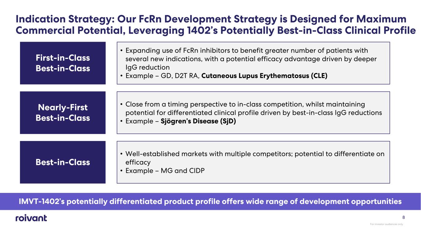 7 Anti-FcRn antibodies, at the beginning of their development cycle, are already outpacing sales trajectory of TNF agents at a similar timepoint; a significant portion of TNF sales were driven by the later entrant, best-in-class drug Note: TNF Sales Source: IQVIA (IMS). FcRn Sales Source: ARGX Investor Presentation Note: Launch year for first TNF – 1998, Launch year for first FcRn – 2022 Note: Other approved mechanisms approved in the US in TNF-approved indications as of 2018 were integrin, JAK, IL-1, IL-6, IL-12/23, IL-17, IL-23, CD20,and CD80/86 $1 $8 $35 $2 TBD TBD 2 Years Post Launch 10 Years Post Launch 20 Years Post Launch In 2018, five approved TNFs in nine indications generated ~$35 billion in sales despite competition from nine other approved novel MOAs Sales ($ in Billions) Approved FcRn products generated >$2.4BN in net sales in their second-year post launch, more than double TNFs at the time TNFs Anti-FcRn Antibodies The Anti-FcRn Antibody Class Could Potentially be Broader than the TNF Class For investor audiences only
