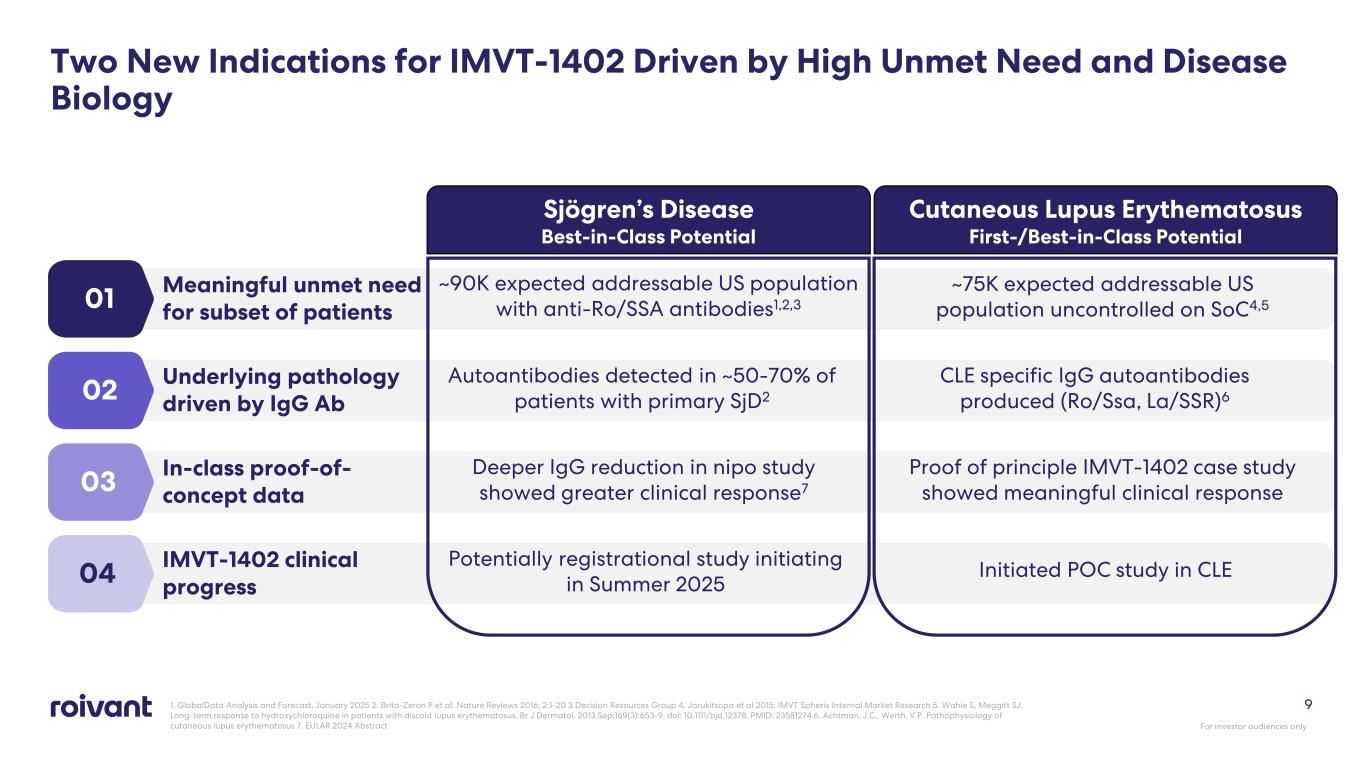 Indication Strategy: Our FcRn Development Strategy is Designed for Maximum Commercial Potential, Leveraging 1402’s Potentially Best-in-Class Clinical Profile 8 Best-in-Class • Well-established markets with multiple competitors; potential to differentiate on efficacy • Example – MG and CIDP First-in-Class Best-in-Class • Expanding use of FcRn inhibitors to benefit greater number of patients with several new indications, with a potential efficacy advantage driven by deeper IgG reduction • Example – GD, D2T RA, Cutaneous Lupus Erythematosus (CLE) Nearly-First Best-in-Class • Close from a timing perspective to in-class competition, whilst maintaining potential for differentiated clinical profile driven by best-in-class IgG reductions • Example – Sjögren’s Disease (SjD) For investor audiences only IMVT-1402’s potentially differentiated product profile offers wide range of development opportunities