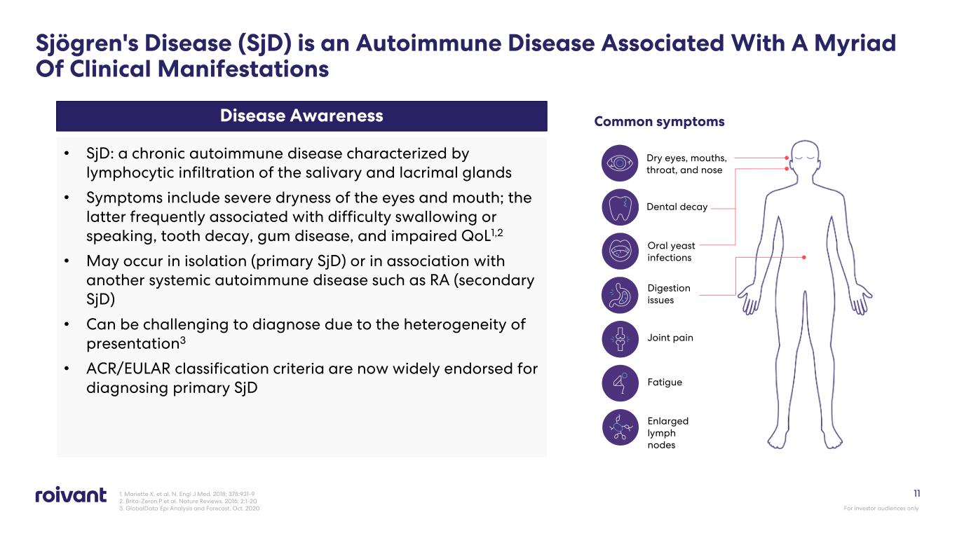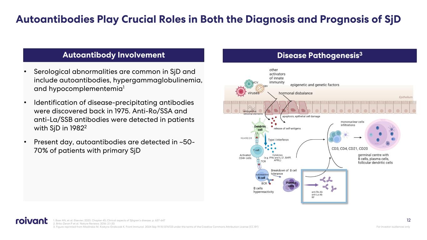 1. Mariette X, et al. N. Engl J Med. 2018; 378:931-9 2. Brito-Zeron P et al. Nature Reviews. 2016; 2:1-20 3. GlobalData Epi Analysis and Forecast, Oct. 2020 11 Disease Awareness • SjD: a chronic autoimmune disease characterized by lymphocytic infiltration of the salivary and lacrimal glands • Symptoms include severe dryness of the eyes and mouth; the latter frequently associated with difficulty swallowing or speaking, tooth decay, gum disease, and impaired QoL1,2 • May occur in isolation (primary SjD) or in association with another systemic autoimmune disease such as RA (secondary SjD) • Can be challenging to diagnose due to the heterogeneity of presentation3 • ACR/EULAR classification criteria are now widely endorsed for diagnosing primary SjD Common symptoms Dry eyes, mouths, throat, and nose Dental decay Oral yeast infections Digestion issues Joint pain Fatigue Enlarged lymph nodes Sjögren's Disease (SjD) is an Autoimmune Disease Associated With A Myriad Of Clinical Manifestations For investor audiences only