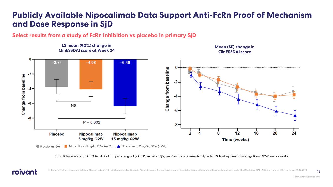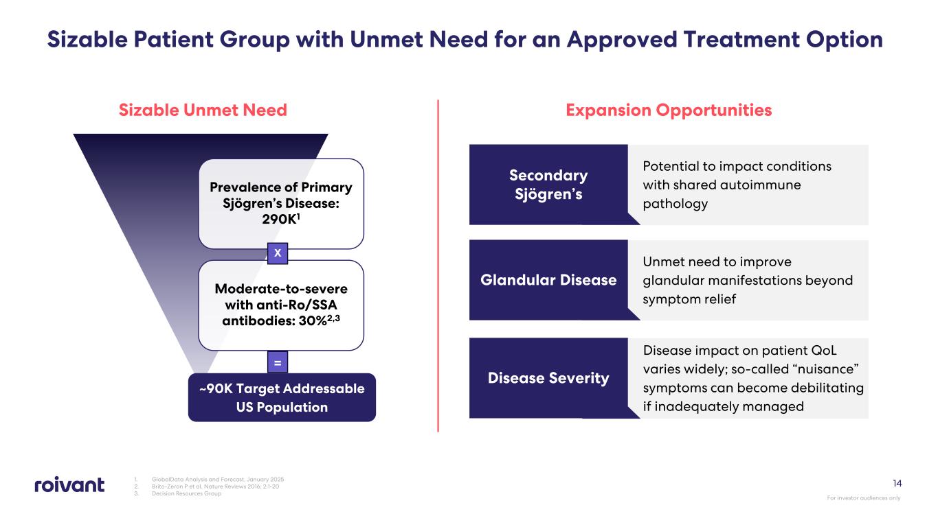 13 Publicly Available Nipocalimab Data Support Anti-FcRn Proof of Mechanism and Dose Response in SjD Select results from a study of FcRn inhibition vs placebo in primary SjD LS mean (90%) change in ClinESSDAI score at Week 24 Mean (SE) change in ClinESSDAI score CI: confidence interval; ClinESSDAI: clinical European League Against Rheumatism Sjögren’s Syndrome Disease Activity Index; LS: least squares; NS: not significant; Q2W: every 2 weeks Nipocalimab 15mg/kg Q2W (n=54)Placebo (n=56) Nipocalimab 5mg/kg Q2W (n=53) Gottenberg JE et al. Efficacy and Safety of Nipocalimab, an Anti-FcRn Monoclonal Antibody, in Primary Sjogren’s Disease: Results from a Phase 2, Multicenter, Randomized, Placebo-Controlled, Double-Blind Study (DAHLIAS). ACR Convergence 2024, November 16-19, 2024 For investor audiences only