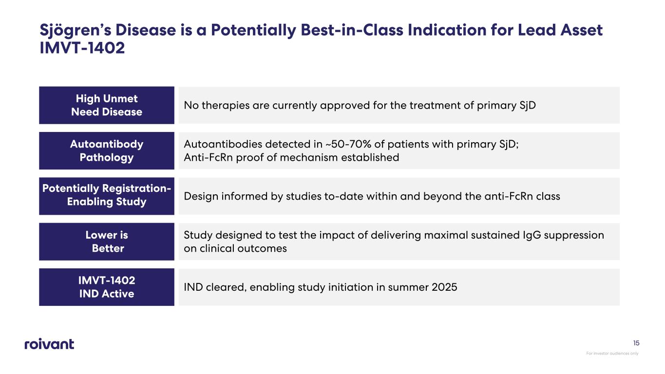 Sizable Patient Group with Unmet Need for an Approved Treatment Option 1. GlobalData Analysis and Forecast, January 2025 2. Brito-Zeron P et al. Nature Reviews 2016; 2:1-20 3. Decision Resources Group Sizable Unmet Need Expansion Opportunities Potential to impact conditions with shared autoimmune pathology Secondary Sjögren’s Unmet need to improve glandular manifestations beyond symptom relief Glandular Disease Disease impact on patient QoL varies widely; so-called “nuisance” symptoms can become debilitating if inadequately managed Disease Severity Prevalence of Primary Sjögren’s Disease: 290K1 Moderate-to-severe with anti-Ro/SSA antibodies: 30%2,3 ~90K Target Addressable US Population X = For investor audiences only 14