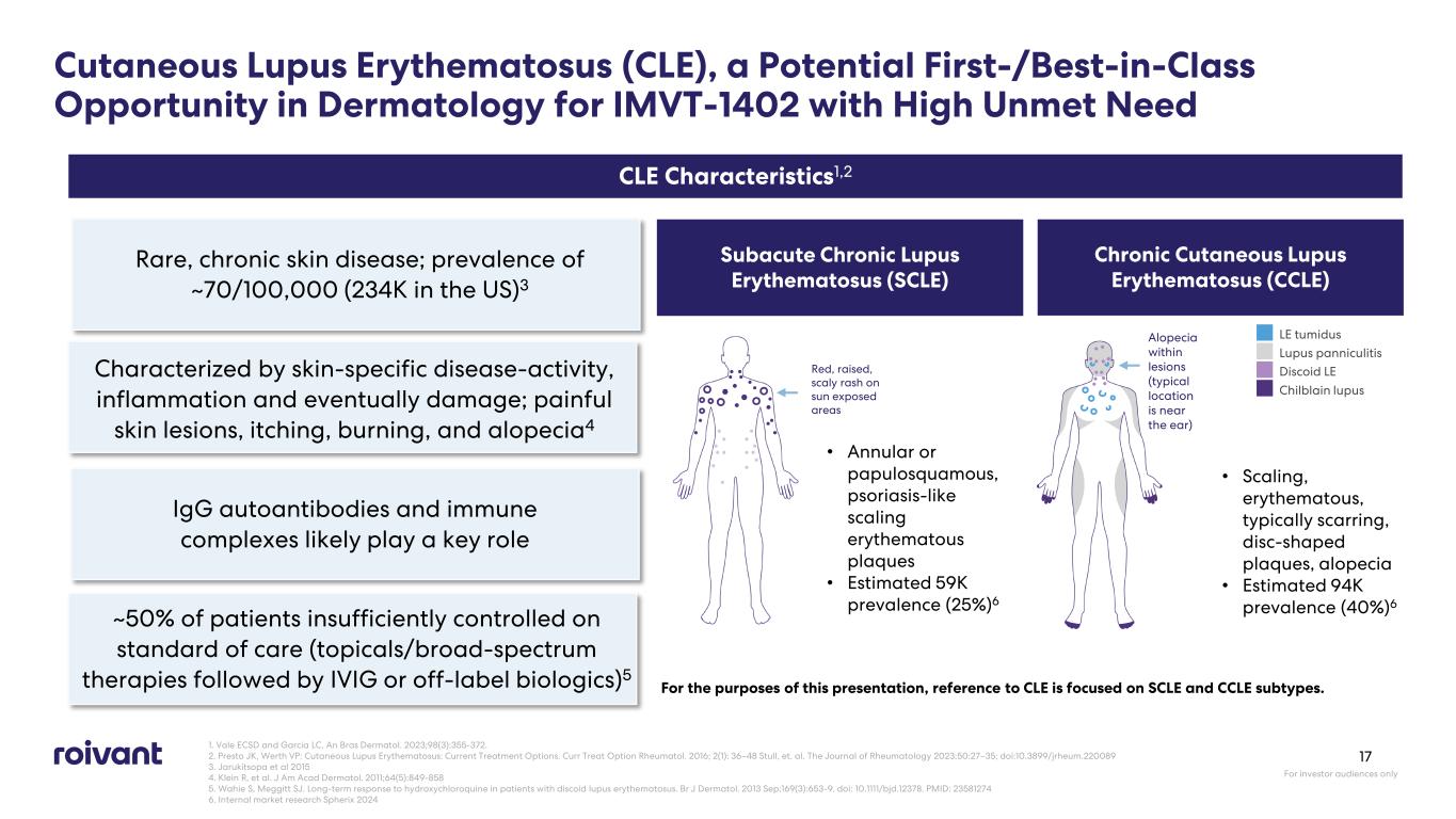 Cutaneous Lupus Erythematosus (CLE), a Potential First-/Best-in-Class Opportunity in Dermatology for IMVT-1402 with High Unmet Need Rare, chronic skin disease; prevalence of ~70/100,000 (234K in the US)3 Characterized by skin-specific disease-activity, inflammation and eventually damage; painful skin lesions, itching, burning, and alopecia4 IgG autoantibodies and immune complexes likely play a key role CLE Characteristics1,2 Subacute Chronic Lupus Erythematosus (SCLE) Chronic Cutaneous Lupus Erythematosus (CCLE) For the purposes of this presentation, reference to CLE is focused on SCLE and CCLE subtypes. • Annular or papulosquamous, psoriasis-like scaling erythematous plaques • Estimated 59K prevalence (25%)6 • Scaling, erythematous, typically scarring, disc-shaped plaques, alopecia • Estimated 94K prevalence (40%)6 LE tumidus Lupus panniculitis Discoid LE Chilblain lupus Alopecia within lesions (typical location is near the ear) Red, raised, scaly rash on sun exposed areas 1. Vale ECSD and Garcia LC. An Bras Dermatol. 2023;98(3):355-372. 2. Presto JK, Werth VP: Cutaneous Lupus Erythematosus: Current Treatment Options. Curr Treat Option Rheumatol. 2016; 2(1): 36–48 Stull, et. al. The Journal of Rheumatology 2023;50:27–35; doi:10.3899/jrheum.220089 3. Jarukitsopa et al 2015 4. Klein R, et al. J Am Acad Dermatol. 2011;64(5):849-858 5. Wahie S, Meggitt SJ. Long-term response to hydroxychloroquine in patients with discoid lupus erythematosus. Br J Dermatol. 2013 Sep;169(3):653-9. doi: 10.1111/bjd.12378. PMID: 23581274 6. Internal market research Spherix 2024 For investor audiences only 17 ~50% of patients insufficiently controlled on standard of care (topicals/broad-spectrum therapies followed by IVIG or off-label biologics)5