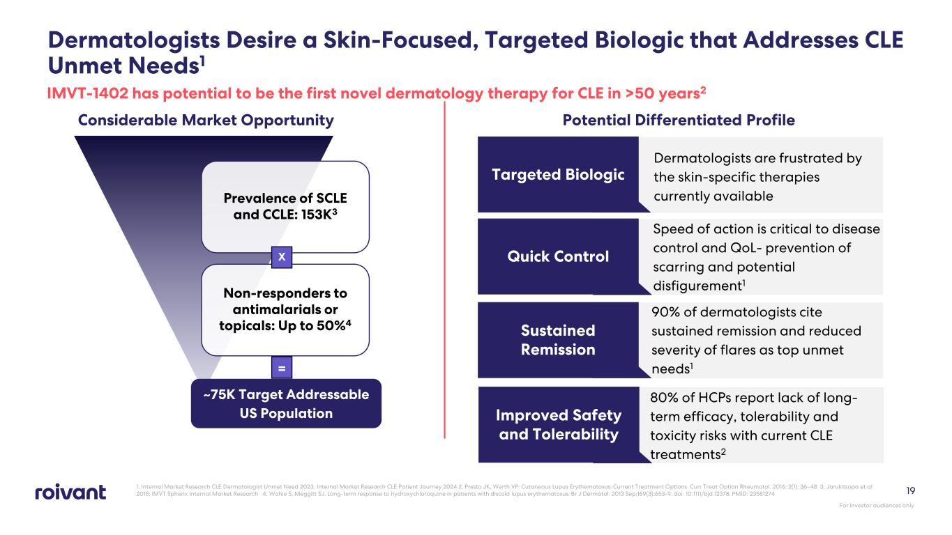 18 IMVT-1402: Disruption of CLE Pathophysiology Upstream by FcRn Inhibition Downstream Biology IMVT-1402 anti-FcRn technology provides upstream inhibition of inflammatory cascade triggered in cells by pathogenic antibodies and immune complexes Upstream Biology • Potential to dampen multiple downstream inflammatory cascades • Deep suppression of IgG autoantibodies and immune complexes has the potential to disrupt CLE pathology CLE Pathogenesis and Anti-FcRn Mechanism IC: Immune Complex, pDCs: Plasma Dendritic Cells; 1. Liu, Z., Davidson, A. Taming lupus—a new understanding of pathogenesis is leading to clinical advances. Nat Med 18, 871–882 (2012). https://doi.org/10.1038/nm.2752 For investor audiences only