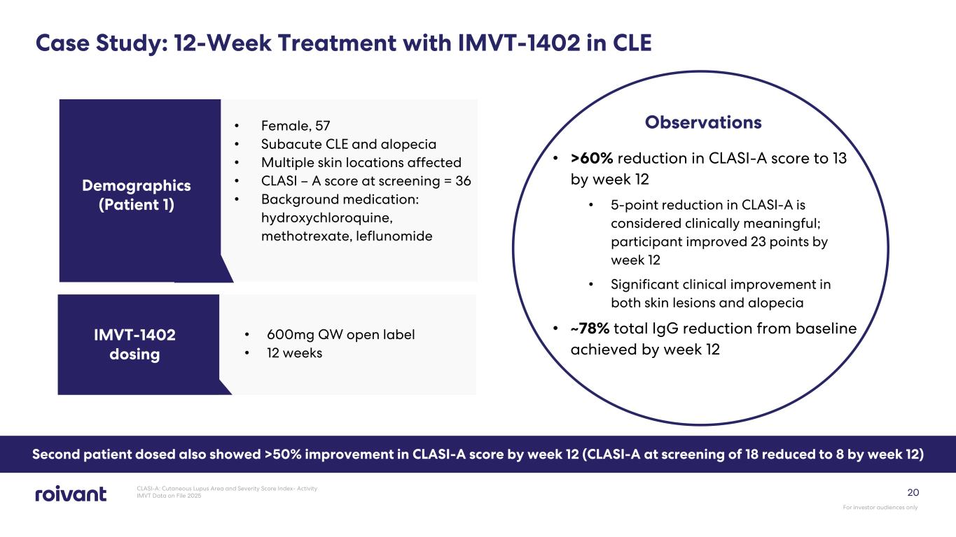 Dermatologists Desire a Skin-Focused, Targeted Biologic that Addresses CLE Unmet Needs1 1. Internal Market Research CLE Dermatologist Unmet Need 2023, Internal Market Research CLE Patient Journey 2024 2. Presto JK, Werth VP: Cutaneous Lupus Erythematosus: Current Treatment Options. Curr Treat Option Rheumatol. 2016; 2(1): 36–48 3. Jarukitsopa et al 2015; IMVT Spherix Internal Market Research 4. Wahie S, Meggitt SJ. Long-term response to hydroxychloroquine in patients with discoid lupus erythematosus. Br J Dermatol. 2013 Sep;169(3):653-9. doi: 10.1111/bjd.12378. PMID: 23581274 Considerable Market Opportunity Potential Differentiated Profile Dermatologists are frustrated by the skin-specific therapies currently available Targeted Biologic Speed of action is critical to disease control and QoL- prevention of scarring and potential disfigurement1 Quick Control 90% of dermatologists cite sustained remission and reduced severity of flares as top unmet needs1 Sustained Remission Prevalence of SCLE and CCLE: 153K3 Non-responders to antimalarials or topicals: Up to 50%4 ~75K Target Addressable US Population X = For investor audiences only 19 IMVT-1402 has potential to be the first novel dermatology therapy for CLE in >50 years2 80% of HCPs report lack of long- term efficacy, tolerability and toxicity risks with current CLE treatments2 Improved Safety and Tolerability