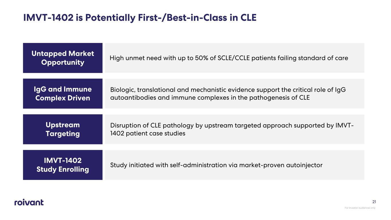 20 Case Study: 12-Week Treatment with IMVT-1402 in CLE • Female, 57 • Subacute CLE and alopecia • Multiple skin locations affected • CLASI – A score at screening = 36 • Background medication: hydroxychloroquine, methotrexate, leflunomide Demographics (Patient 1) • 600mg QW open label • 12 weeks IMVT-1402 dosing Observations • >60% reduction in CLASI-A score to 13 by week 12 • 5-point reduction in CLASI-A is considered clinically meaningful; participant improved 23 points by week 12 • Significant clinical improvement in both skin lesions and alopecia • ~78% total IgG reduction from baseline achieved by week 12 CLASI-A: Cutaneous Lupus Area and Severity Score Index- Activity IMVT Data on File 2025 For investor audiences only Second patient dosed also showed >50% improvement in CLASI-A score by week 12 (CLASI-A at screening of 18 reduced to 8 by week 12)