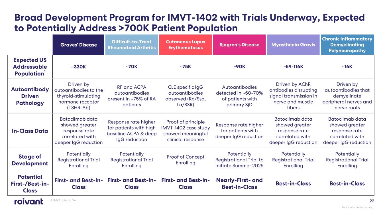 IMVT-1402 is Potentially First-/Best-in-Class in CLE Untapped Market Opportunity High unmet need with up to 50% of SCLE/CCLE patients failing standard of care IgG and Immune Complex Driven Biologic, translational and mechanistic evidence support the critical role of IgG autoantibodies and immune complexes in the pathogenesis of CLE Upstream Targeting Disruption of CLE pathology by upstream targeted approach supported by IMVT- 1402 patient case studies IMVT-1402 Study Enrolling Study initiated with self-administration via market-proven autoinjector For investor audiences only 21