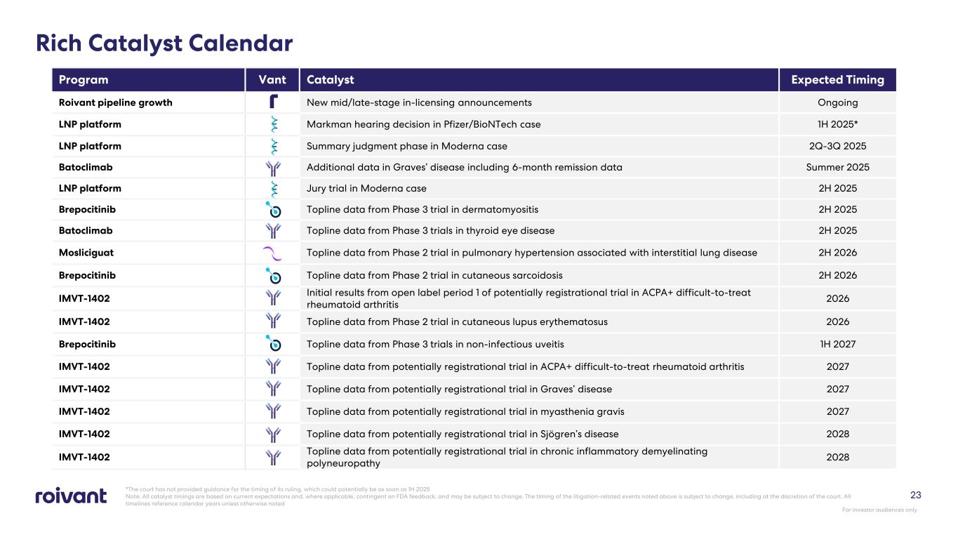 23 Rich Catalyst Calendar *The court has not provided guidance for the timing of its ruling, which could potentially be as soon as 1H 2025 Note: All catalyst timings are based on current expectations and, where applicable, contingent on FDA feedback, and may be subject to change. The timing of the litigation-related events noted above is subject to change, including at the discretion of the court. All timelines reference calendar years unless otherwise noted Program Vant Catalyst Expected Timing Roivant pipeline growth New mid/late-stage in-licensing announcements Ongoing LNP platform Markman hearing decision in Pfizer/BioNTech case 1H 2025* LNP platform Summary judgment phase in Moderna case 2Q-3Q 2025 Batoclimab Additional data in Graves’ disease including 6-month remission data Summer 2025 LNP platform Jury trial in Moderna case 2H 2025 Brepocitinib Topline data from Phase 3 trial in dermatomyositis 2H 2025 Batoclimab Topline data from Phase 3 trials in thyroid eye disease 2H 2025 Mosliciguat Topline data from Phase 2 trial in pulmonary hypertension associated with interstitial lung disease 2H 2026 Brepocitinib Topline data from Phase 2 trial in cutaneous sarcoidosis 2H 2026 IMVT-1402 Initial results from open label period 1 of potentially registrational trial in ACPA+ difficult-to-treat rheumatoid arthritis 2026 IMVT-1402 Topline data from Phase 2 trial in cutaneous lupus erythematosus 2026 Brepocitinib Topline data from Phase 3 trials in non-infectious uveitis 1H 2027 IMVT-1402 Topline data from potentially registrational trial in ACPA+ difficult-to-treat rheumatoid arthritis 2027 IMVT-1402 Topline data from potentially registrational trial in Graves’ disease 2027 IMVT-1402 Topline data from potentially registrational trial in myasthenia gravis 2027 IMVT-1402 Topline data from potentially registrational trial in Sjögren’s disease 2028 IMVT-1402 Topline data from potentially registrational trial in chronic inflammatory demyelinating polyneuropathy 2028 For investor audiences only