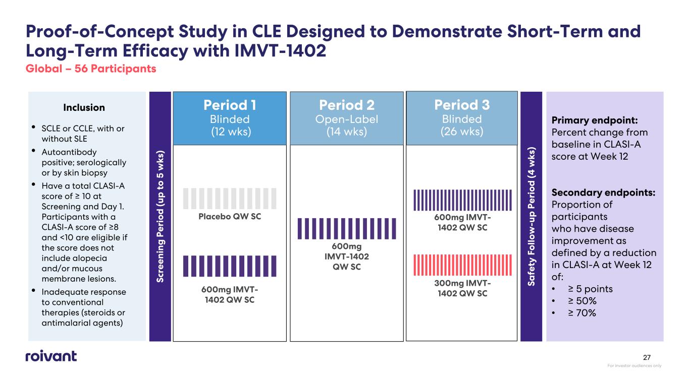 Period 2 Open-Label (14 wks) Period 1 Blinded (12 wks) Proof-of-Concept Study in CLE Designed to Demonstrate Short-Term and Long-Term Efficacy with IMVT-1402 Global – 56 Participants Inclusion • SCLE or CCLE, with or without SLE • Autoantibody positive; serologically or by skin biopsy • Have a total CLASI-A score of ≥ 10 at Screening and Day 1. Participants with a CLASI-A score of ≥8 and <10 are eligible if the score does not include alopecia and/or mucous membrane lesions. • Inadequate response to conventional therapies (steroids or antimalarial agents) Sc re en in g P er io d (u p t o 5 w ks ) 600mg IMVT- 1402 QW SC Primary endpoint: Percent change from baseline in CLASI-A score at Week 12 Secondary endpoints: Proportion of participants who have disease improvement as defined by a reduction in CLASI-A at Week 12 of: • ≥ 5 points • ≥ 50% • ≥ 70% Sa fe ty F ol lo w -u p P er io d (4 w ks ) Placebo QW SC 600mg IMVT-1402 QW SC Period 3 Blinded (26 wks) 600mg IMVT- 1402 QW SC 300mg IMVT- 1402 QW SC For investor audiences only 27